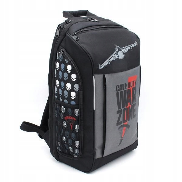Сірий і чорний рюкзак повністю розроблено в темі Call of Duty: Warzone. На передній частині зображено великий логотип гри, літак, що летить над зоною падіння, а з боків зображені символи черепа. Внутрішня підкладка в синьо-сірому камуфляжі.