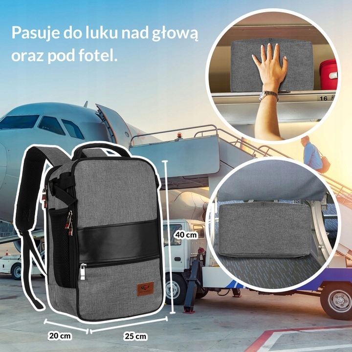 Рюкзак відповідає розмірним вимогам Wizzair та Ryanair, що робить його ідеальним ручним покважем для отримання літака. Крім того, завдяки ручці за валізу подорож стає ще зручнішим.
