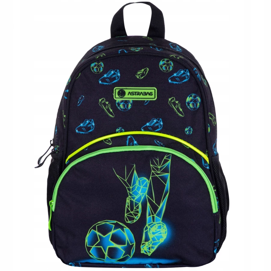 Рюкзак Astrabag з одним відділенням – це задоволення для всіх футбольних уболівальників. Насичена динамічна геометрична графіка із зображенням футболіста перед ударом по м'ячу та численні піктограми привертають увагу кожного шанувальника цього найпопулярнішого виду спорту. В одній місткій камері помістяться необхідні речі кожного малюка. Дві бічні сітчасті кишені ідеально підходять для зберігання пляшки з водою. Рюкзак має світловідбиваючі елементи для безпеки.