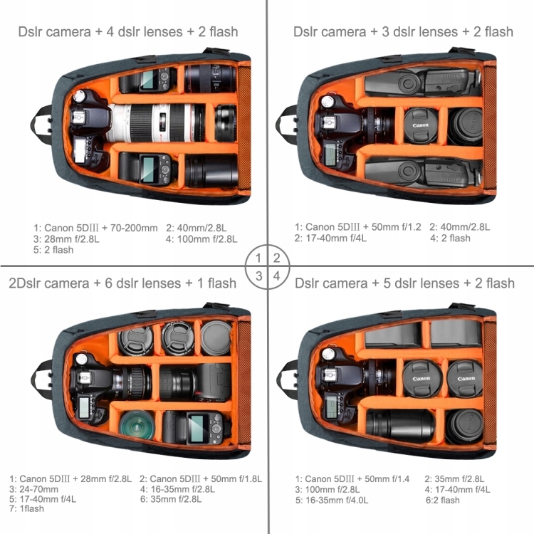 Фоторюкзак PULUZ має основне відділення, розділене на окремі частини для кожного предмета, що зберігається. У них можна помістити корпус дзеркальної камери, об'єктиви, фільтри і спалах. Стінки органайзера з'єднані за допомогою липучок, тому ви можете легко змінювати конфігурацію і розміри окремих його осередків. Така точна посадка забезпечує безпеку обладнання та легкий доступ до нього.
