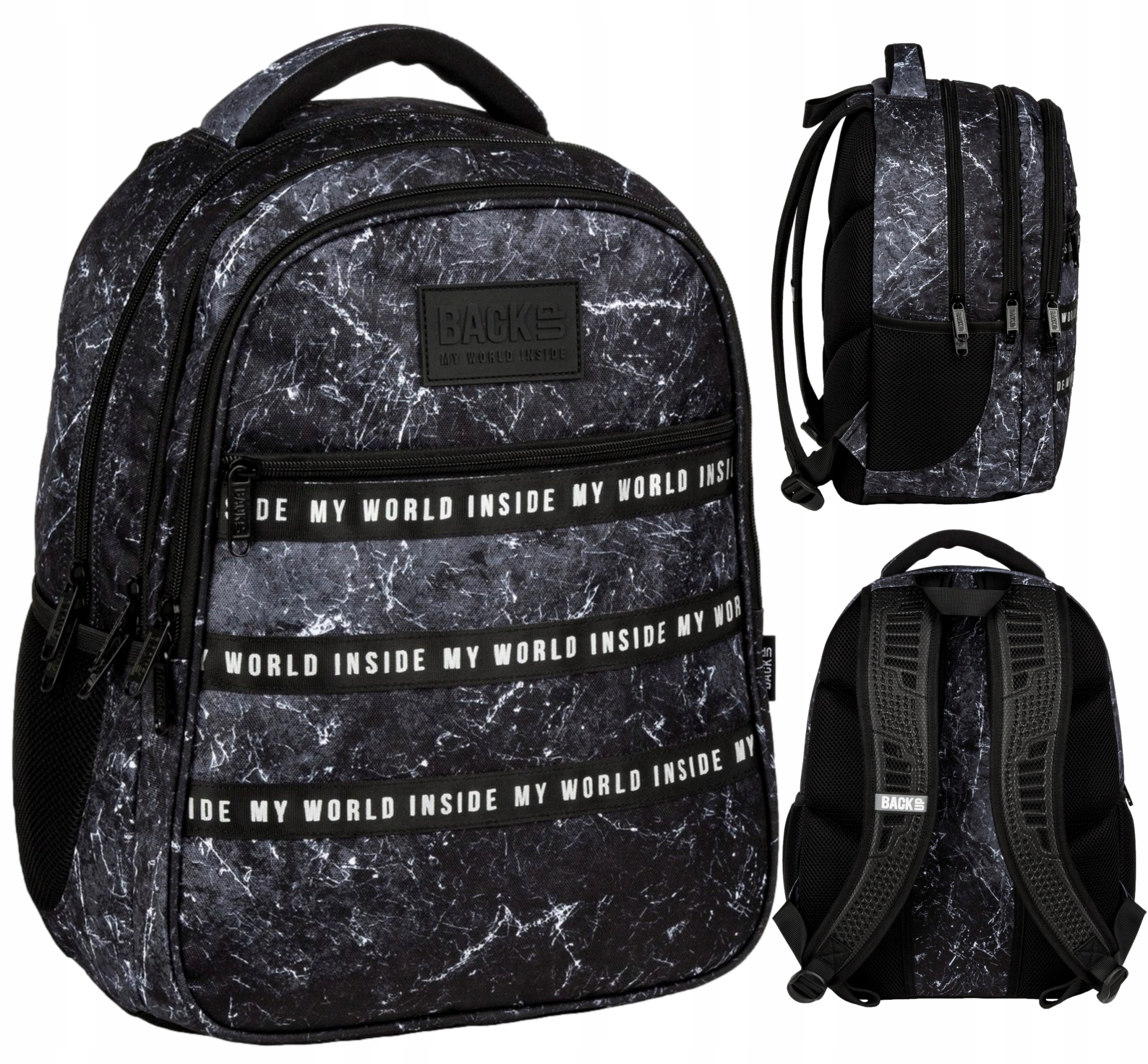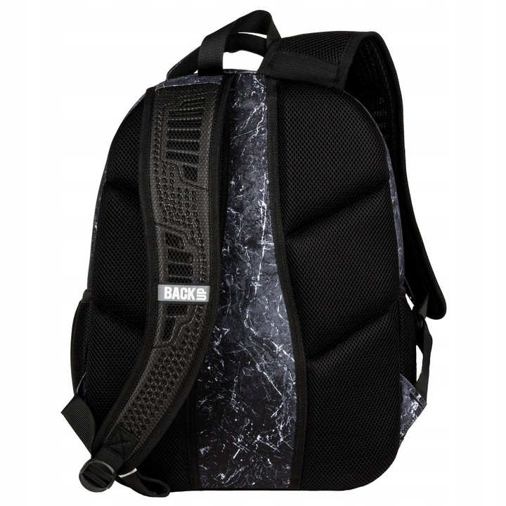 Рюкзак чорного кольору з мармуровим однотонним малюнком, збагаченим 3 стрічками зі світловідбиваючим написом.