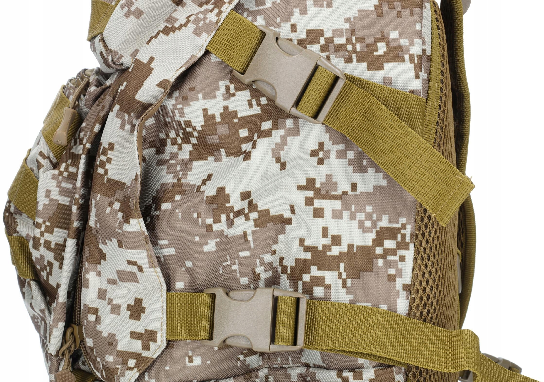 Спинка рюкзака посилена і покрита поролоном, має нагрудний ремінь і стегновий ремінь, що забезпечує правильну поставу тіла і комфорт при носінні. Ремені оснащені D-подібними кільцями, на які можна легко повісити додаткові предмети.