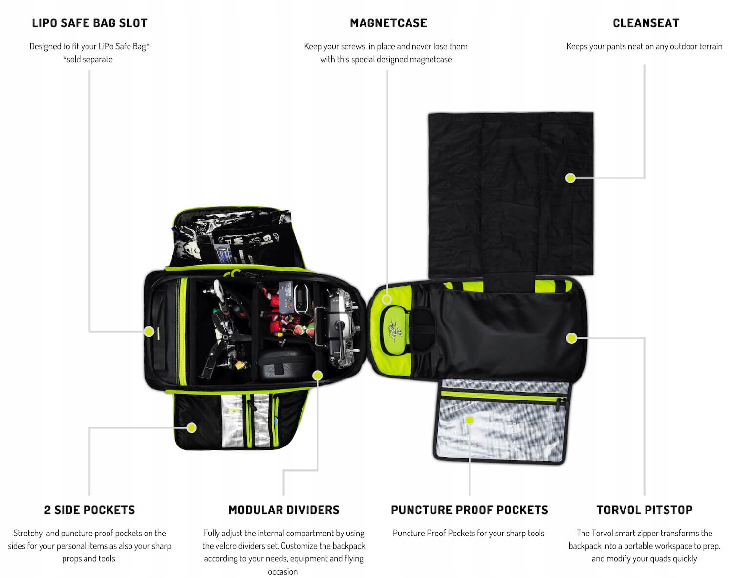 Torvol Quad PITSTOP Backpack PRO легко переносить 4 гоночні дрони та все обладнання FPV, таке як окуляри, передавач, LiPo, інструменти та багато іншого . Завдяки зоні PITSTOP від Torvol розумна застібка-блискавка Torvol перетворює рюкзак на портативний робочий простір для швидкого й легкого налаштування та модифікації ваших дронів.