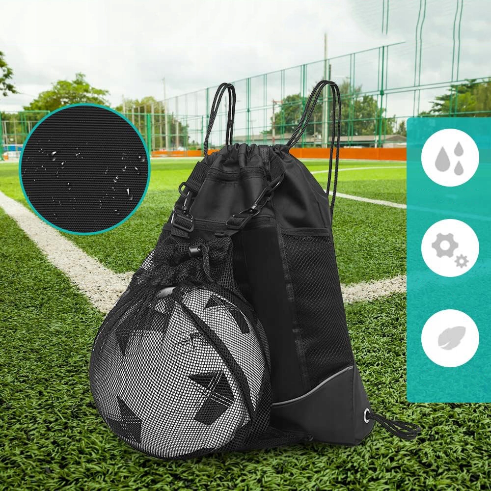 Спортивна сумка на шнурках має сітчасту сумку із блискавкою внизу, яку можна зняти та закріпити на липучці верхня частина сумки для футболу, баскетболу, волейболу, м’ячі для регбі, бейсбольні шоломи тощо. З обох боків сумки також є 2 сітчасті кишені для пляшки з водою та парасольки.