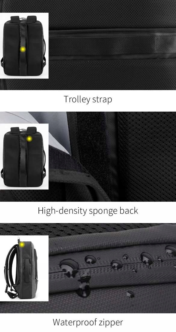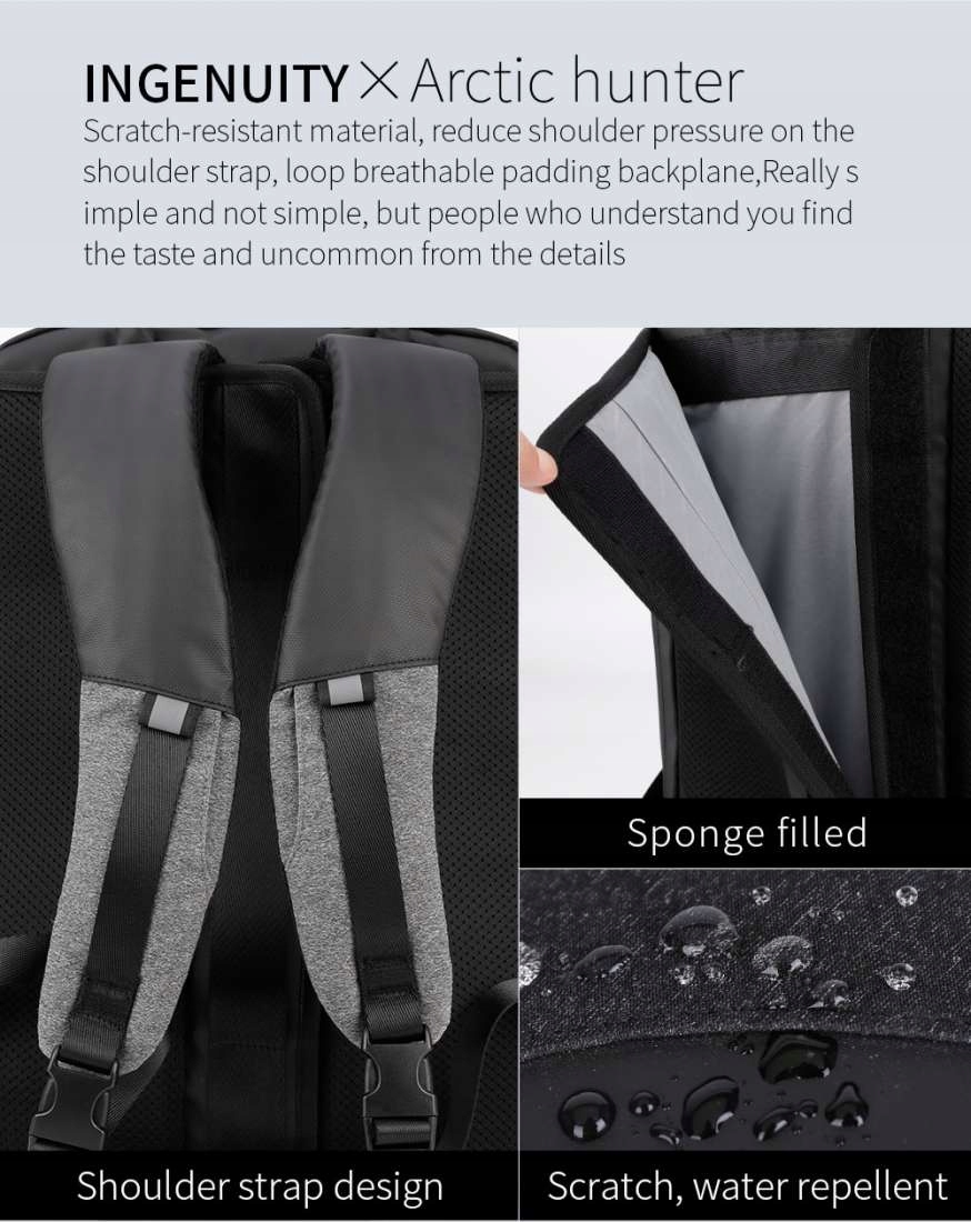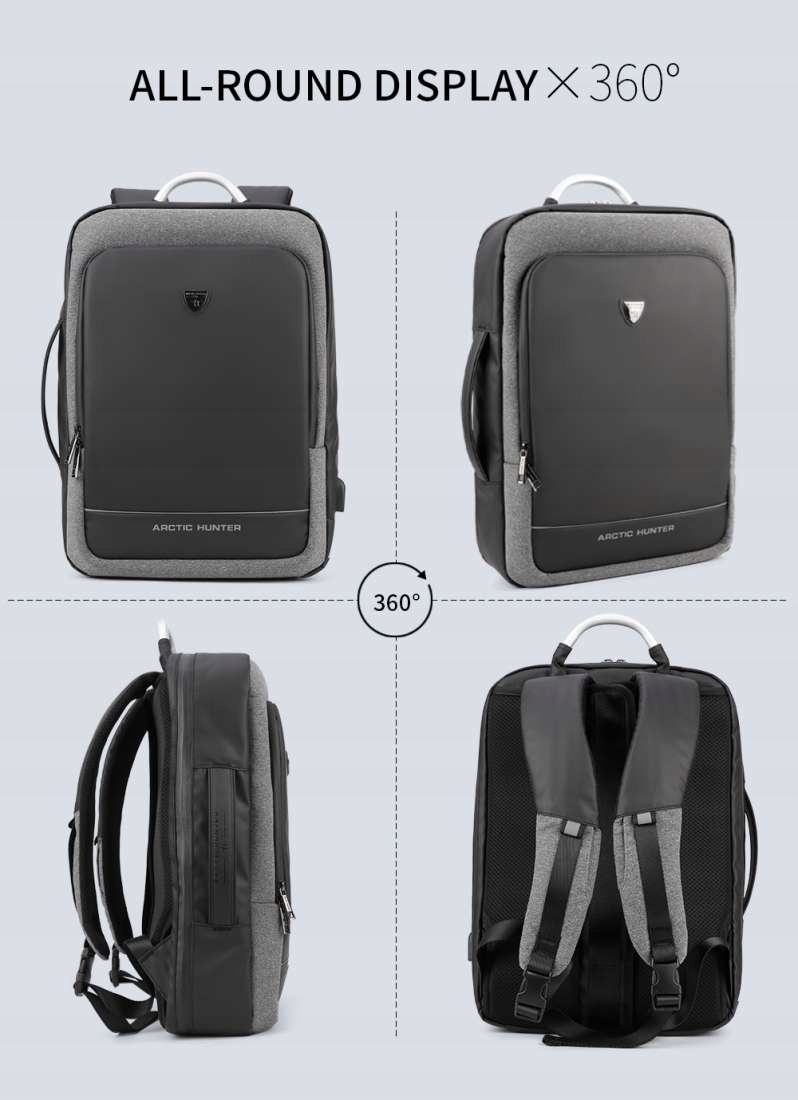 Сучасний рюкзак для ноутбука відArctic Hunter із символом B00227Lз мінімалістичним дизайном. Виготовлений зі стійких до подряпин і водостійких матеріалів - Оксфорд і ПВХ. Основні блискавки прогумовані, тому дощ не просочується в рюкзак. Найбільшою перевагою цього рюкзака є незвичайний спосіб відкривання основного відділення - його можна відкрити як валізу, що забезпечує необмежений доступ до всього вмісту. Основне відділення має кишеню для ноутбука до 17,3" і кишеню для планшета до 10" - обидва закріплені еластичними ремінцями, кишені для аксесуарів і дуже великий простір для пакування одягу. Місткість рюкзака можна збільшити одним рухом - розстібаючи одну блискавку, ми отримуємо 10 см глибини рюкзака. У цей рюкзак можна з успіхом упакувати найнеобхідніше навіть для 7-денної подорожі. На передній частині рюкзака є кишеня з органайзером для підручних речей, сюди можна помістити гаманець, телефон, ручки, документи або планшет. Спинка рюкзака обшита гнучкою губкою ергономічної форми, завдяки чому вміст рюкзака захищений від ударів і рюкзак зручно сидить на спині. На задній стінці рюкзака є нейлонова лямка, завдяки якій ви можете розмістити рюкзак на ручці польотної сумки. Лямки рюкзака плоскі, широкі та S-подібні, завдяки чому рюкзак краще лягає на плечі, а вага розподіляється рівномірно. На лямках є дві кишені для дрібниць і відбивачі для кращої видимості в темний час доби. Рюкзак також має дві міцні ручки (включаючи одну сталеву), тому ви можете зручно носити його в рукахяк сумку. Рюкзак додатково оснащений зовнішнім USB портом, тому для зарядки телефону або іншого портативного пристрою не потрібно виймати павербанк з рюкзака. Рюкзак Arctic Hunter з символом B00227L ідеально підходить для будь-яких умов, як щоденних, так і для багатоденної подорожі, де велике значення мають невеликі розміри ручної поклажі.