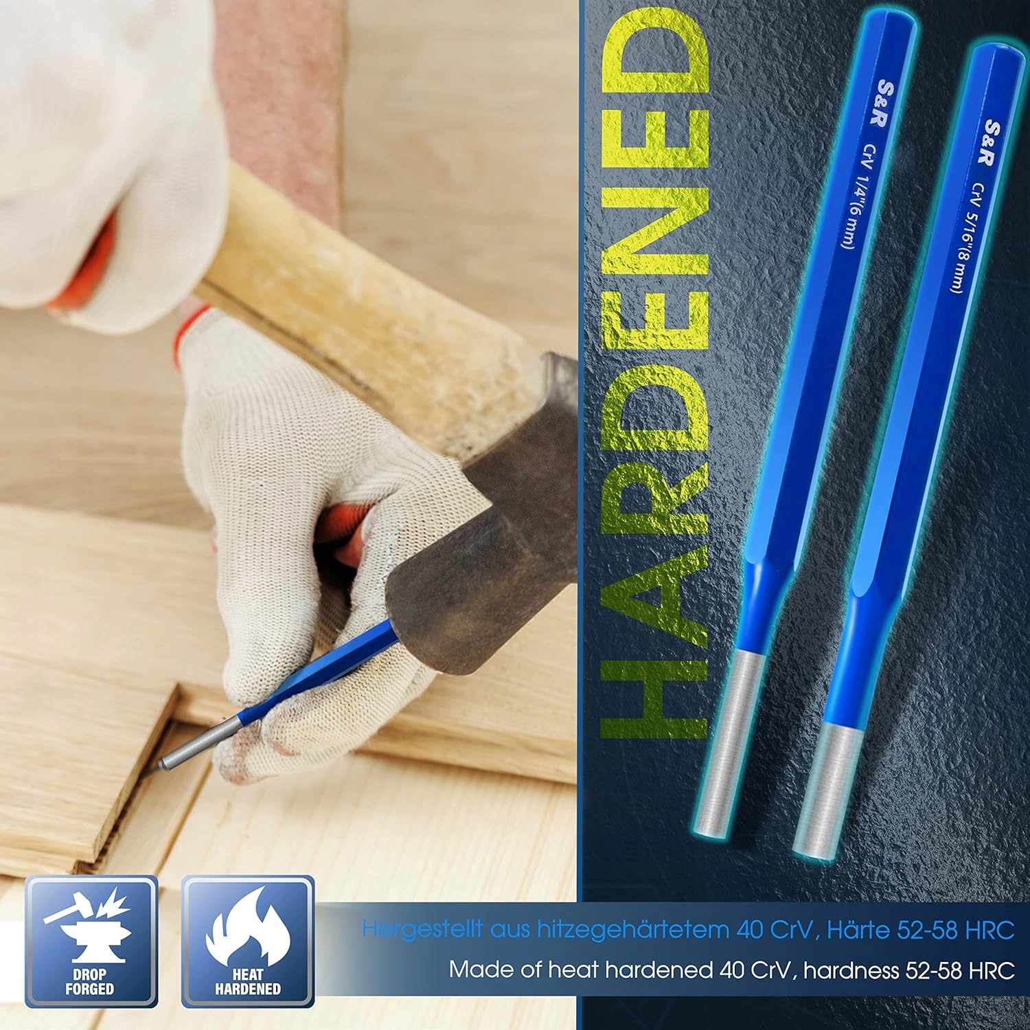 Полірована ріжуча поверхня та загартована сталь CrV створюють надзвичайно міцне поєднання для легкого й точного дрейфування та пробивання. Пробійники ідеально підходять для забивання та вибивання:
