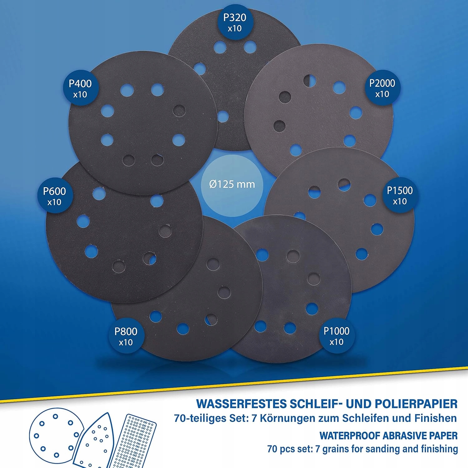 S&R водонепроникний паперовий абразивний диск 125 мм, для коливальної шліфувальної машини на липучках, набір дисків 70 P320, P400, P600, P800, P1000, P1500, P2000 X10 Технічні: