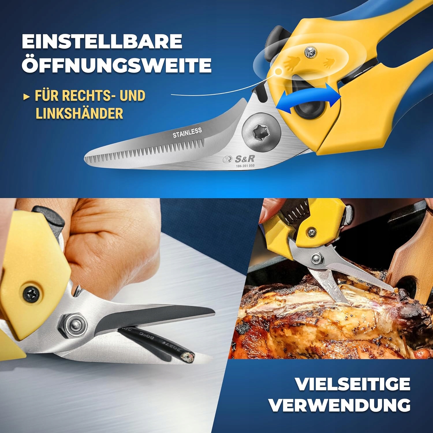 Універсальні ножиці S&R дозволяють легко і точно вирізати завдяки м'якій та міцній пластмасі, шкірі, картону та багатьом іншим. Що є справжнім викликом для звичайних домашніх ножиць, їх можна легко і безпечно вирізати універсальними ножицями. Електричний до 2,5 мм