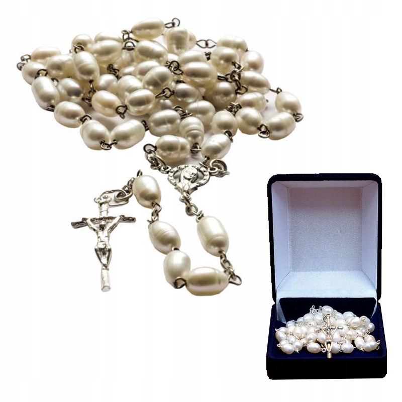 Елегантний, надзвичайно ефектний розарій ручної роботи справжніх прісноводних перлів. І медальйон із зображенням Богоматері, і папський хрест, який угорі розарію, виготовлені зі срібла 925 проби. Для особистої молитви та в подарунок. Декоративний футляр.