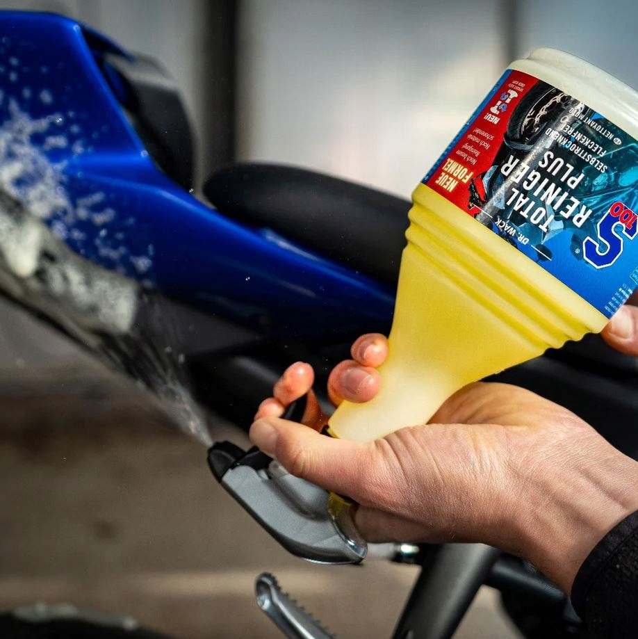 - Побризкайте на весь мотоцикл S100 Total Reiniger Plus. Залиште препарат на мотоциклі від 5 до 30 хвилин, залежно від ступеня забруднення. При необхідності скористайтеся губкою. Потім ретельно промийте мотоцикл сильним струменем води та дайте йому висохнути або скористайтеся замшевою тканиною, щоб висушити місця, куди вода не стікає. Мотоцикл висихає самостійно без використання тканини та не залишає смуг.