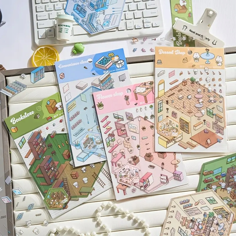 Чудовий набір - 4 повні набори наклейок - собаки, коти, плюшеві ведмеді, зайчики (книгарня, магазин, флорист, кафе).