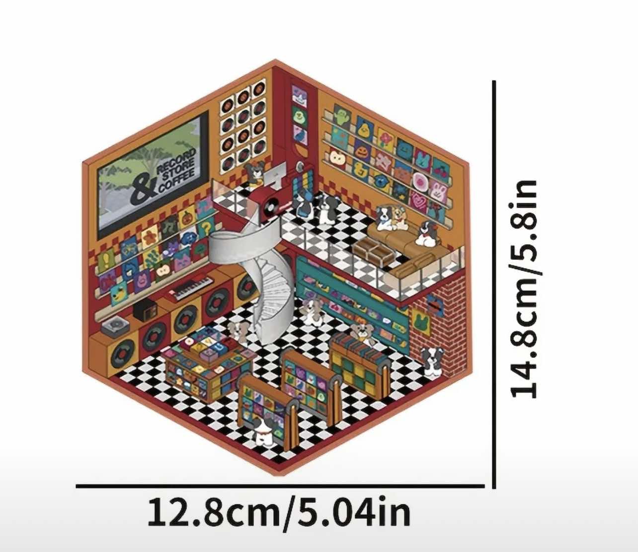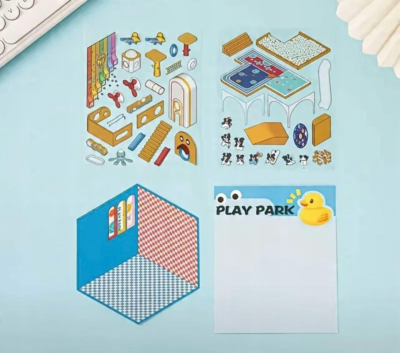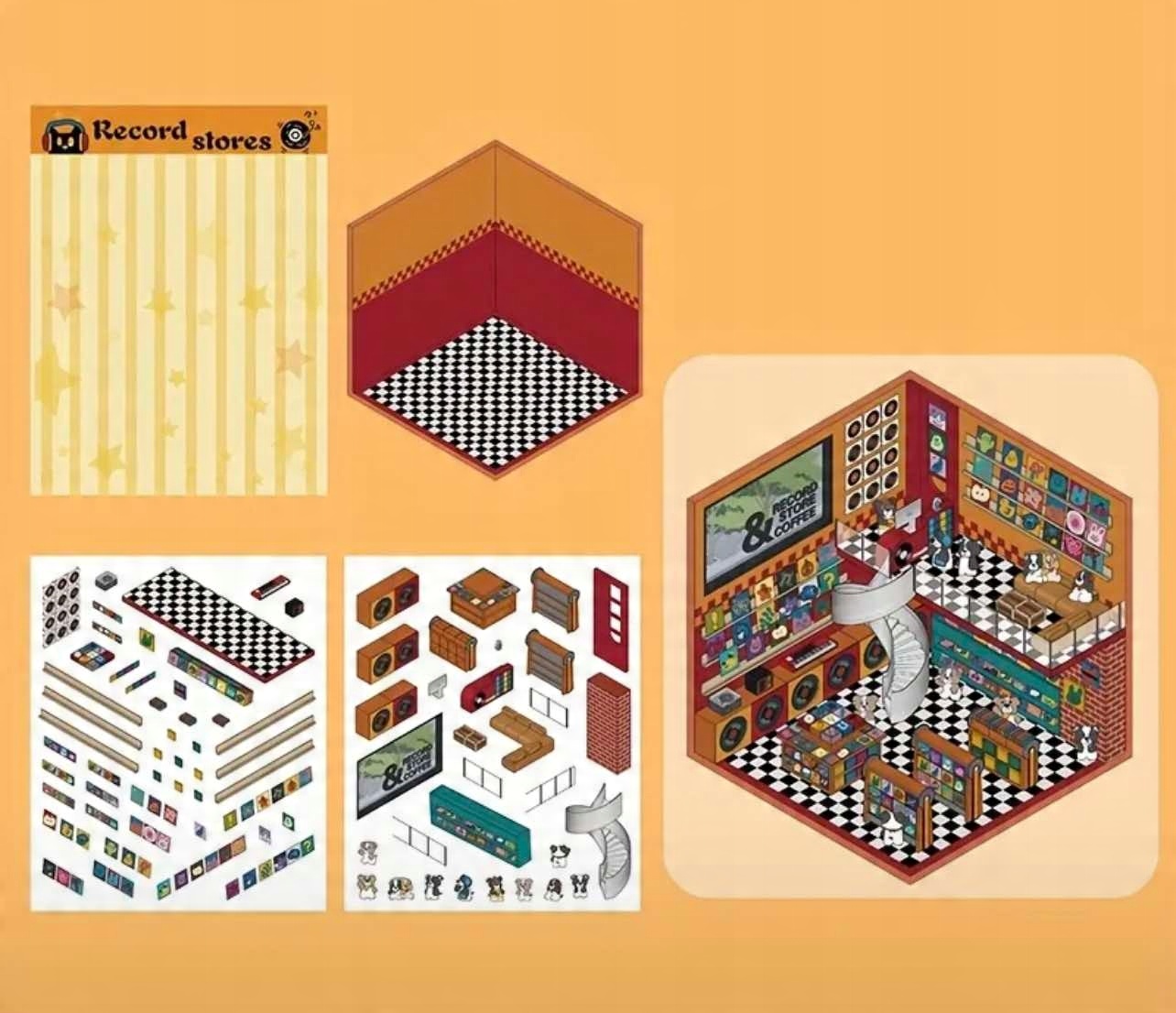 Почніть розваги з 3D -наклейок. Кожна одиночна упаковка складається з однієї картонної кімнати (шестистороння форма), плюс один великий аркуш наклейок з елементами обладнання, тобто меблів, килимів, полиць та іншого великого аркуша з персонажами - це прекрасні солодкі тварини.