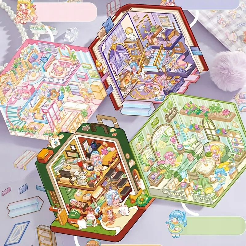 Почніть розваги з 3D -наклейок. Кожна одиночна упаковка складається з однієї картонної кімнати (шестикутна або нерегулярна форма), плюс один великий аркуш наклейок з елементами обладнання, тобто меблі, килимів, полиць та іншого великого аркуша з персонажами - це прекрасні солодкі тварини.
