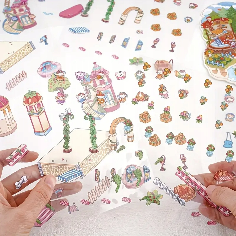 Почніть розваги з 3D -наклейок. Кожна окрема упаковка складається з однієї картонної будівлі або ландшафту (шестикутника або нерегулярної форми), плюс три великі аркуші наклейок з елементами обладнання, тобто меблі, аксесуарів, книг, фаршированих тварин, рослин, полиць та багатьох інших.