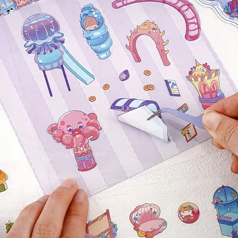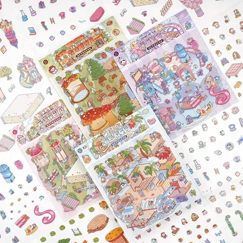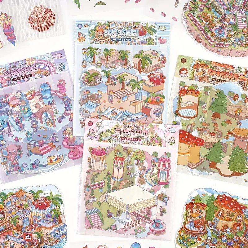 Чудовий набір - 4 повні великі набори наклейок з різними просторами: аквапарк, Райський острів, будинок лісових грибів, садовий сад.