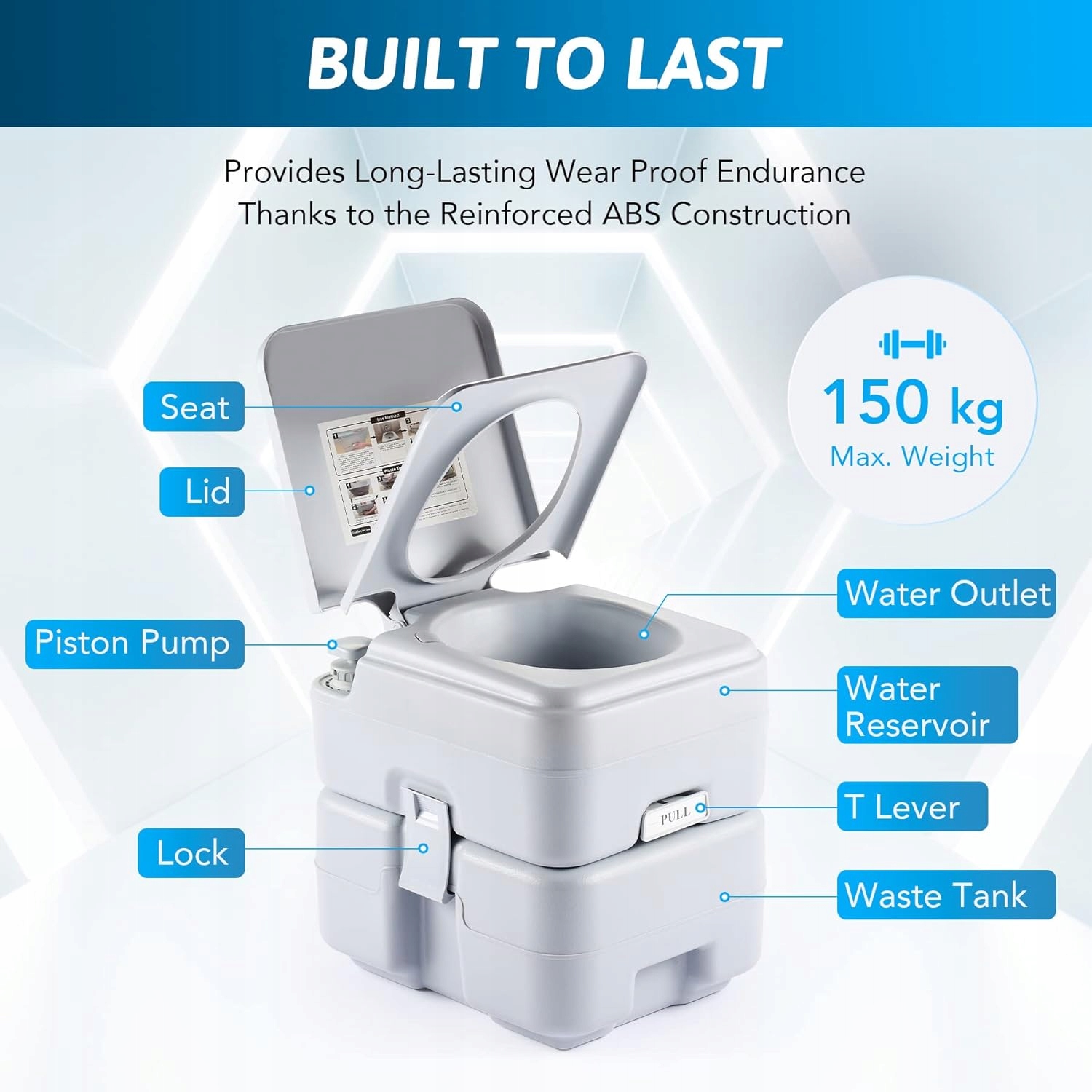 Переносний туалет: портативний унітаз має повнорозмірне сидіння та кришку для комфортного використання дітьми та дорослими вагою до 180 кг, забезпечуючи комфортне купання, де б ви не були.
