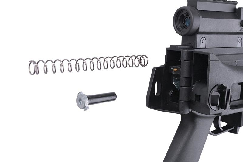 Репліка використовує систему швидкої заміни пружини - Enter & Convert™. Щоб дістатися до коробки передач, просто вийміть штифт, розташований поруч із засувкою приклада, і витягніть елемент блокування приклада. Це дозволяє швидко та ефективно регулювати потужність копії відповідно до очікуваних умов на ігровому полі без необхідності мати доступ до майстерні чи ряду спеціалізованих інструментів - немає необхідності знімати Gerbox з репліки - хоча ця операція також дуже проста та швидка.
