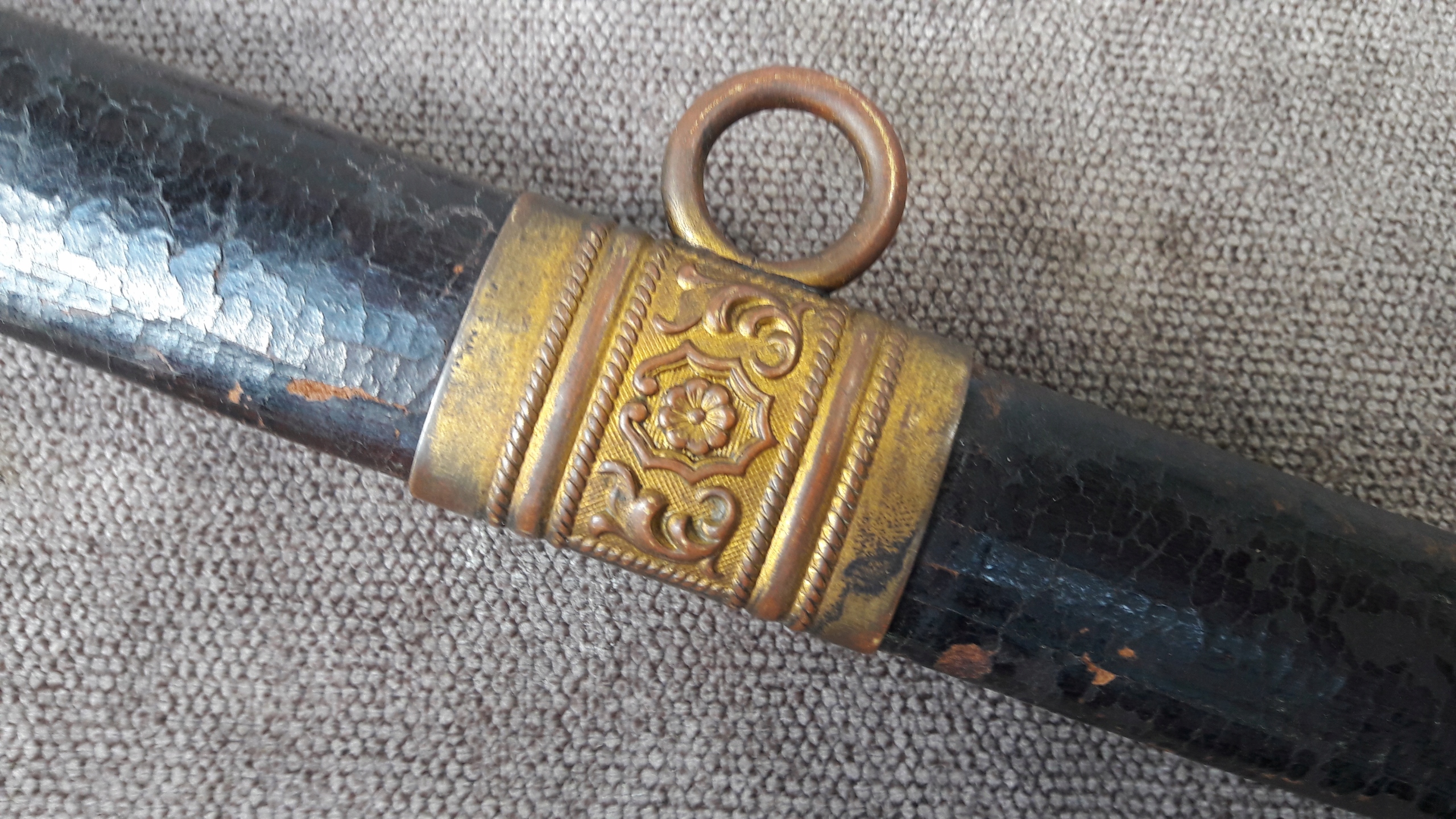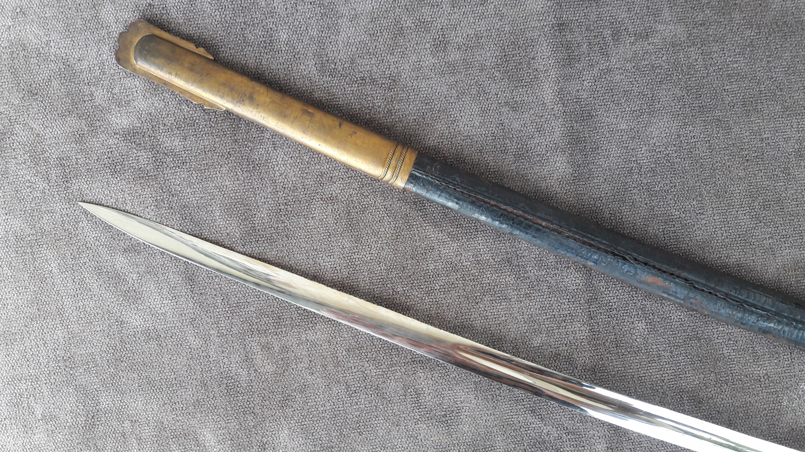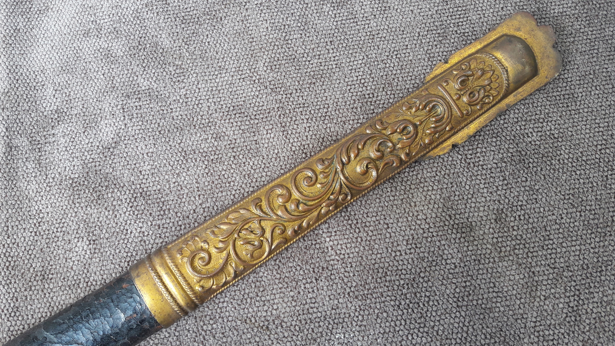 Металева піхва, оброблена шкірою, з латунними фурнітурою.
