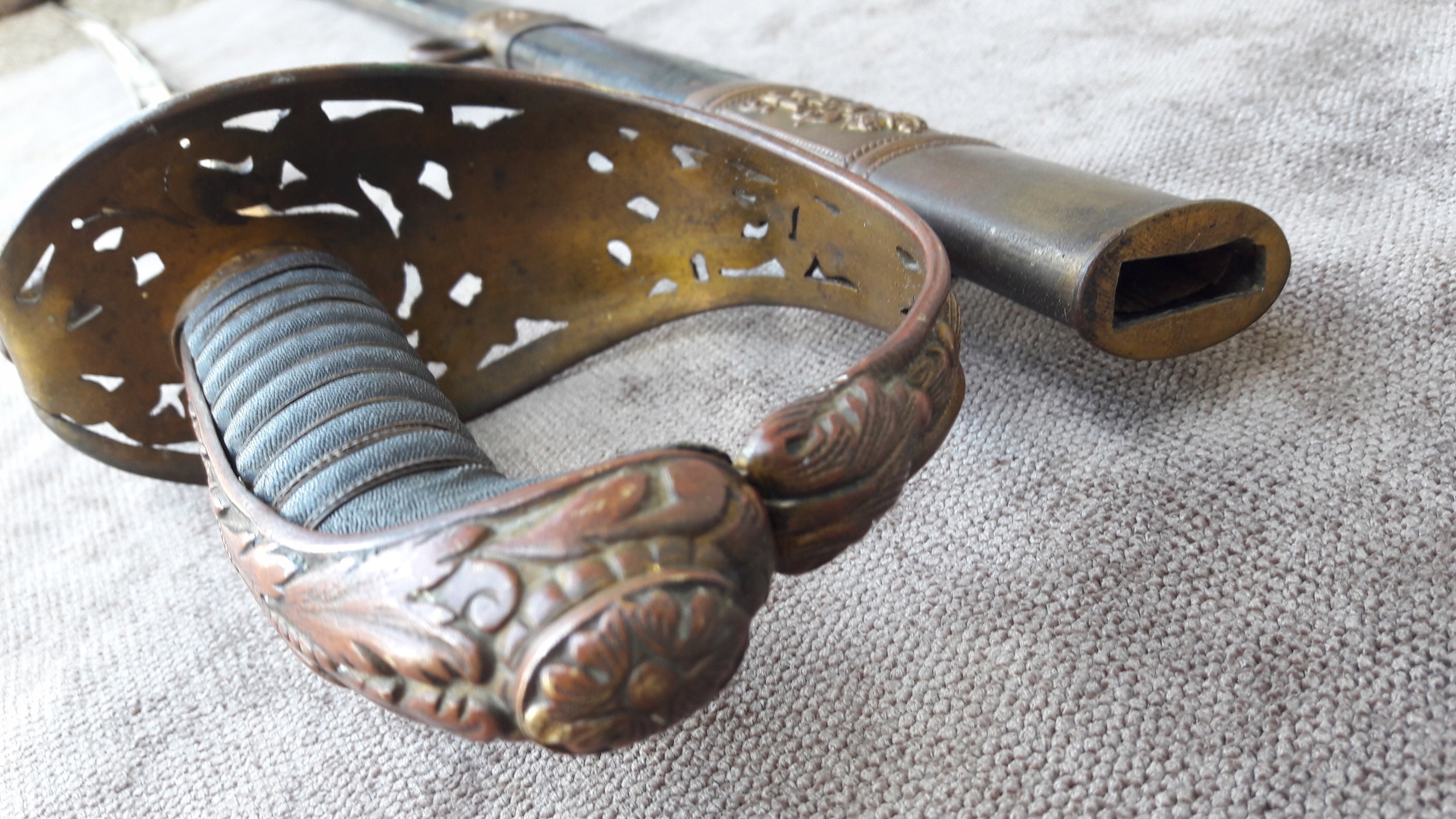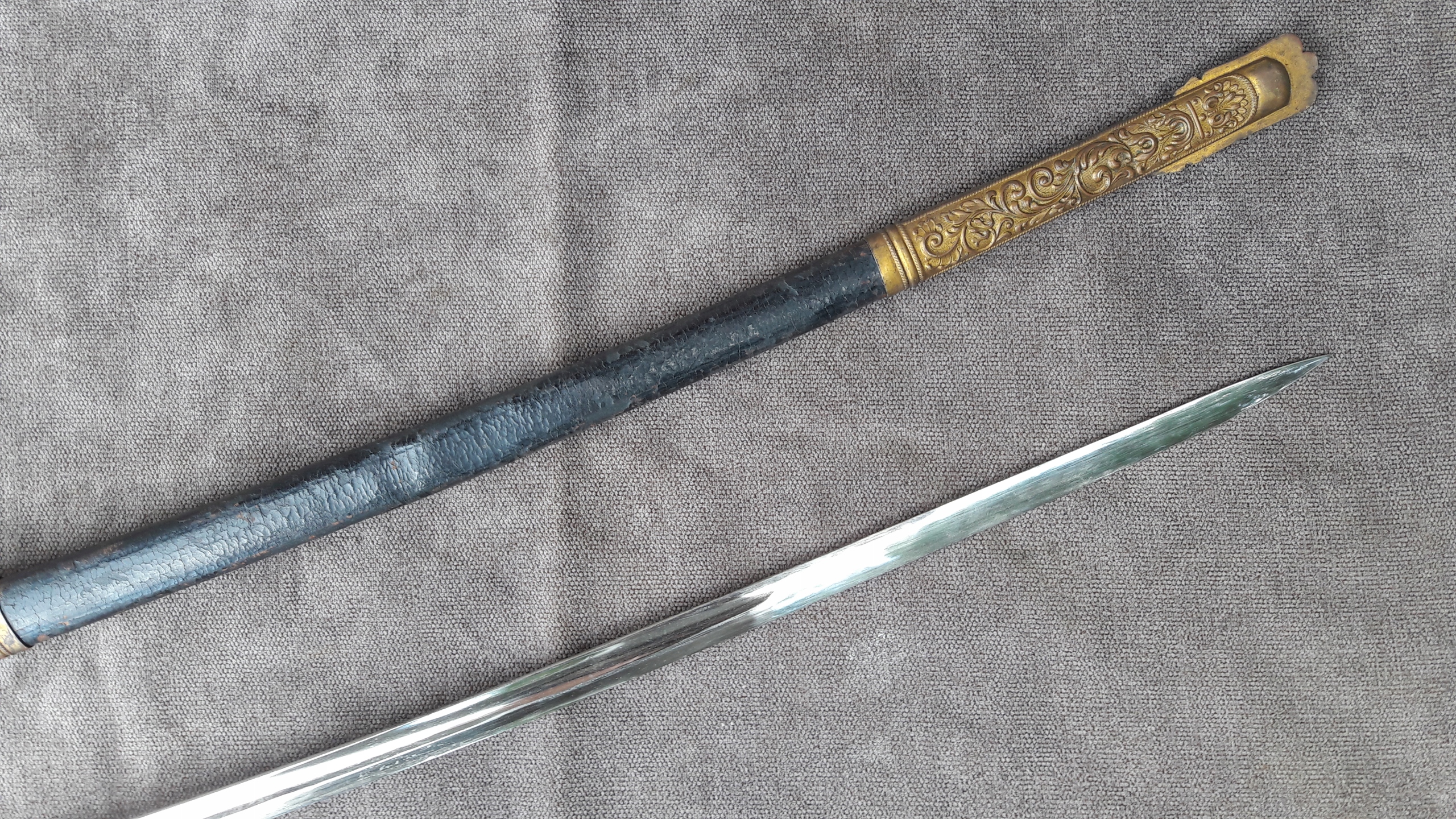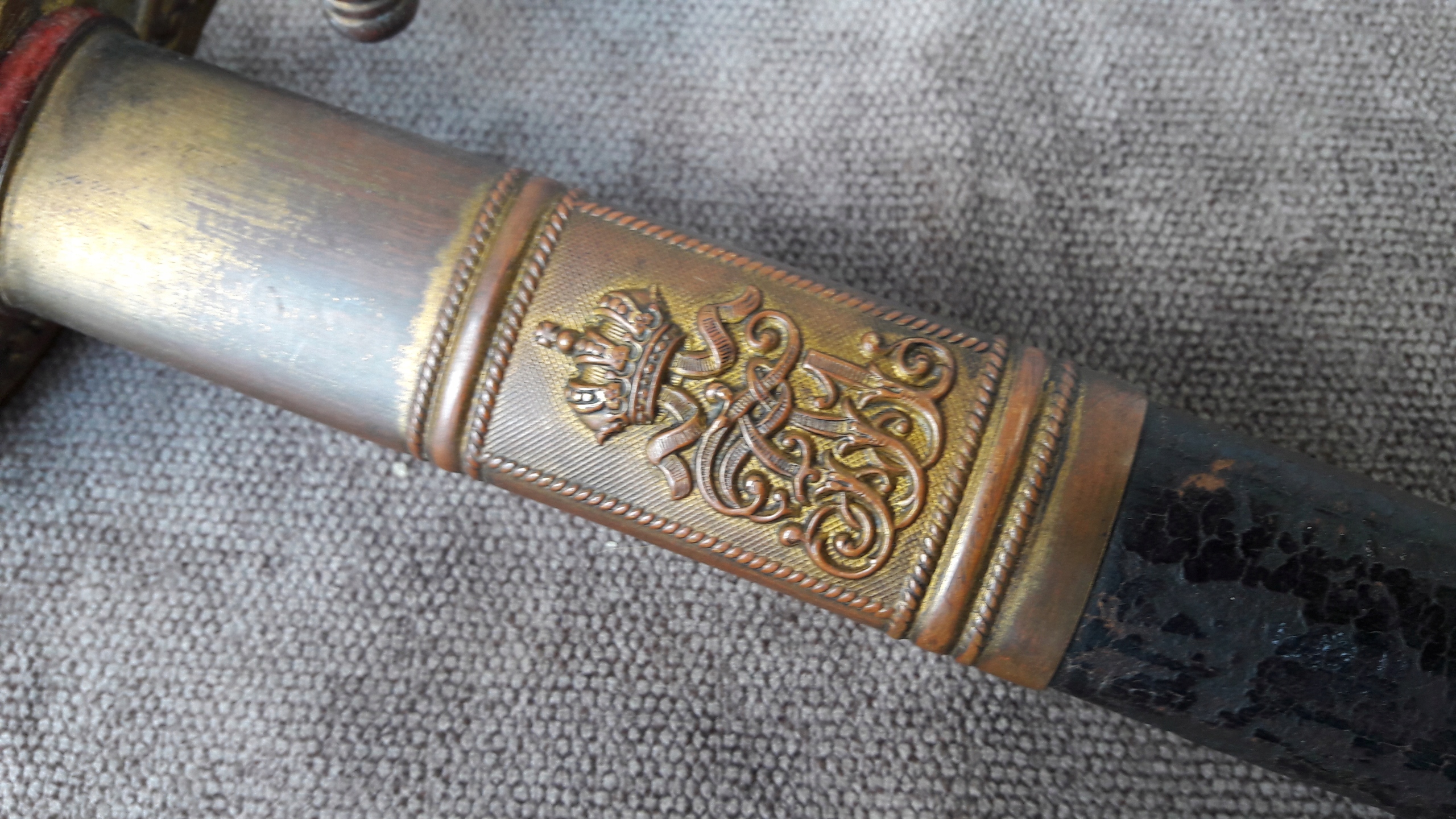 Металева піхва, оброблена шкірою, з латунними фурнітурою.