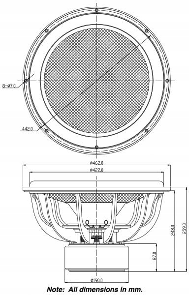 Величезна контурна стільникова діафрагма має зовнішню оболонку зі скловолокна для максимальної жорсткості та стійкості до пошкоджень, а гумова підвіска з інтегрованим ущільненням забезпечує екстремальний хід завдяки лінійності та довговічності. 8-дюймова подвійна магнітна система з дзеркальним розташуванням для підтримки повної лінійності довгого ходу та забезпечення усунення спотворень завдяки асиметрії податливості для наднизьких механічних спотворень навіть на зовнішніх межах міцності. І все це зберігається в ідеальному центрі завдяки твердому литому алюмінію кошик зі спицями, що забезпечує стабільність у будь-якому положенні кріплення.