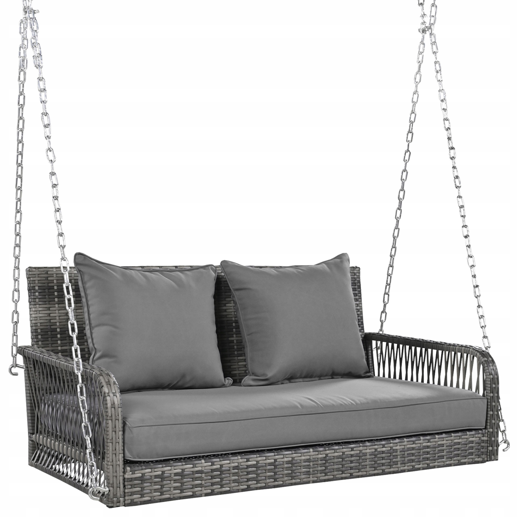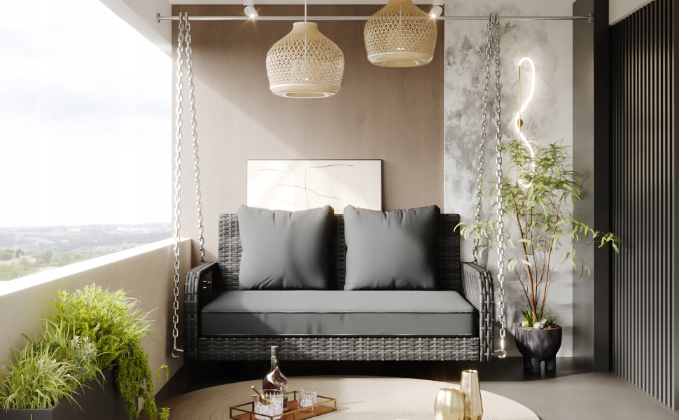 - Вишукані деталі: Весь розмах виготовлений із заплетеного ротанга і оснащений просторою подушкою з подвійним сидінням та двома подушками від зворотного зворотного зв'язку, що ще більше зміцнює загальний ефект набору