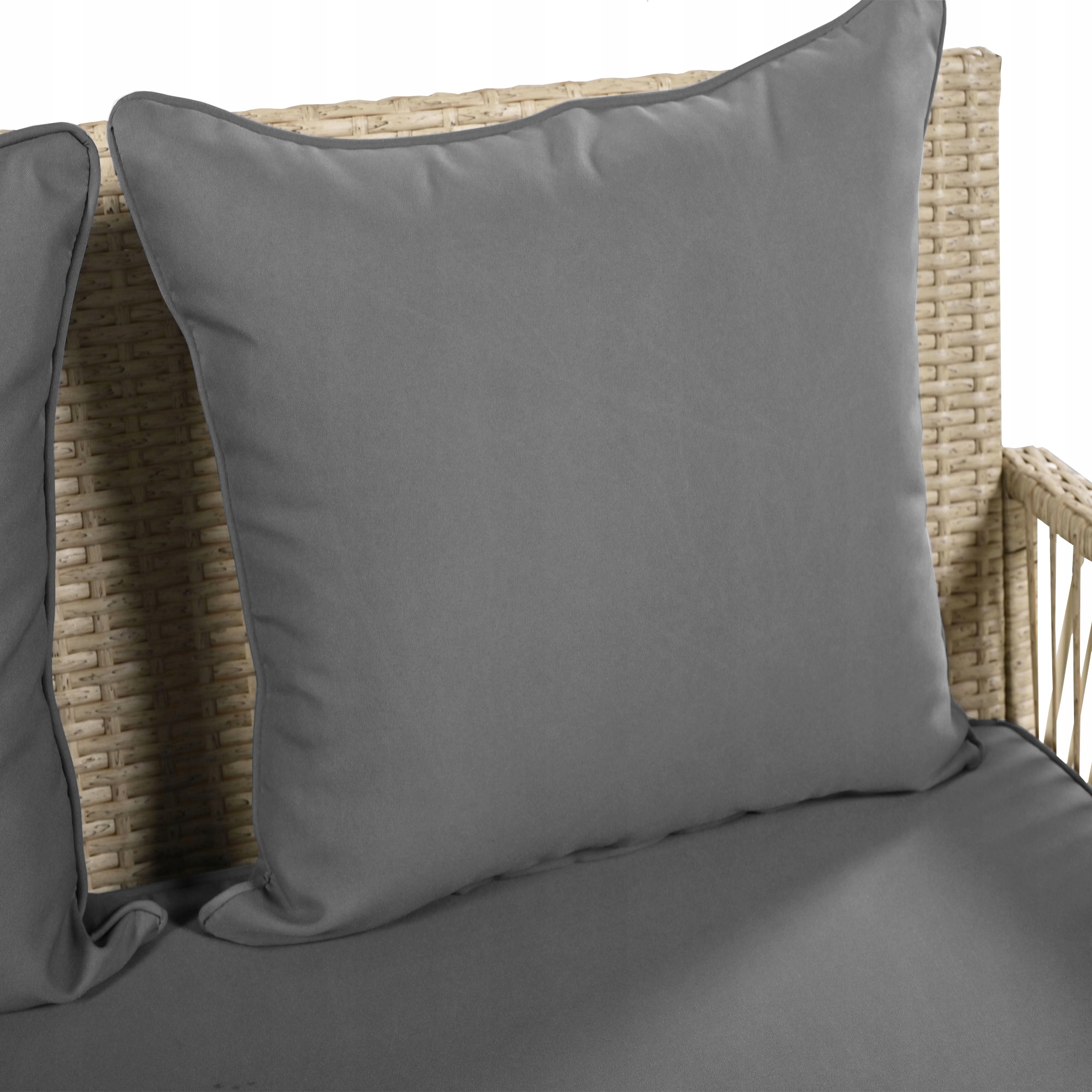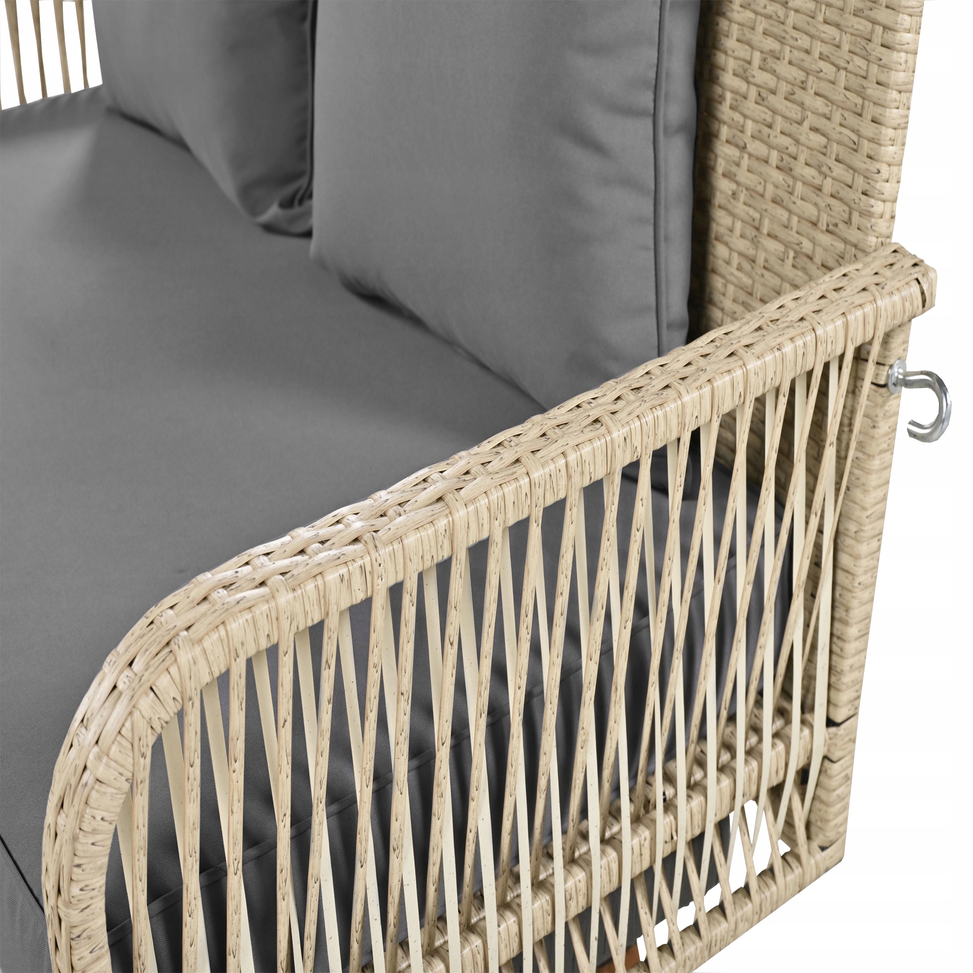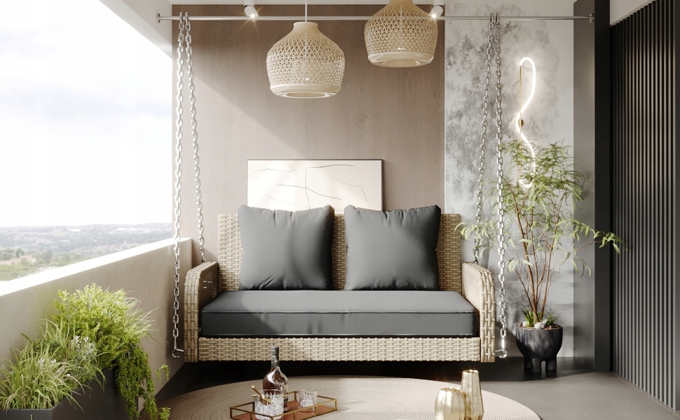 - Вишукані деталі: Весь розмах виготовлений із заплетеного ротанга і оснащений просторою подушкою з подвійним сидінням та двома подушками від зворотного зворотного зв'язку, що ще більше зміцнює загальний ефект набору