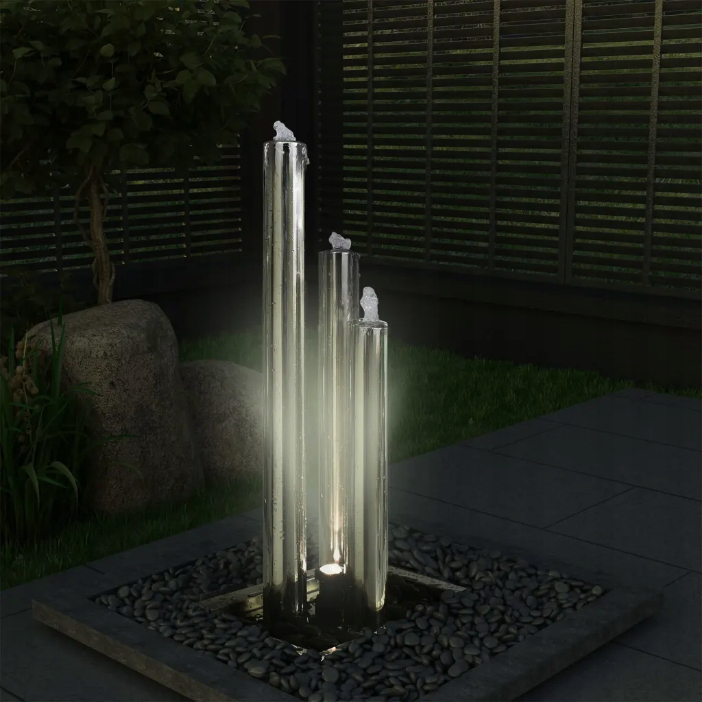 Наш блискучий садовий фонтан з трьома циліндрами оснащений світлодіодним та насосом. Це змінить ваш сад або терасу замість відпочинку для очей і вух. Садовий фонтан був розроблений, щоб гарантувати постійний, рівний потік води. Він оснащений пластиковою основою, яку можна закопнути в землю, щоб отримати бажаний ефект. Лоток з нержавіючої сталі, встановлений у верхній частині основи, прикрашений прикріпленими гальками. Водоспад постачається з усіма необхідними аксесуарами. Ви можете легко підключити його до прикріпленого водяного насоса. Він виготовлений з високоякісної 304 нержавіючої сталі з дзеркальним покриттям, завдяки якому він стійкий до хлорованої води та дуже міцного. Цей продукт вимагає складання.