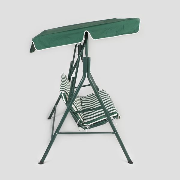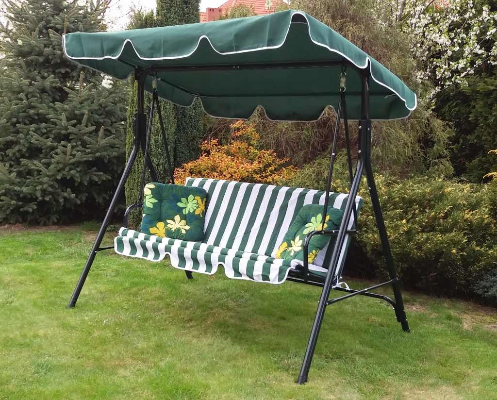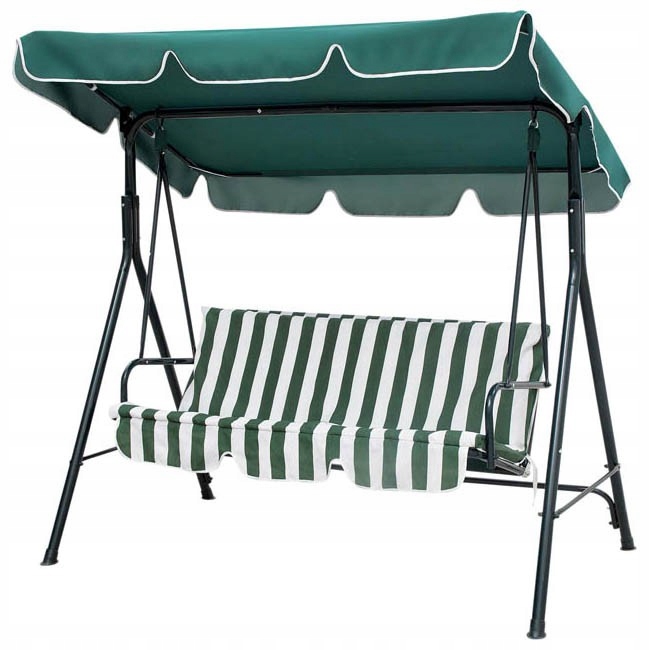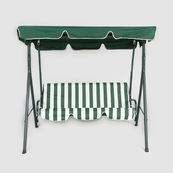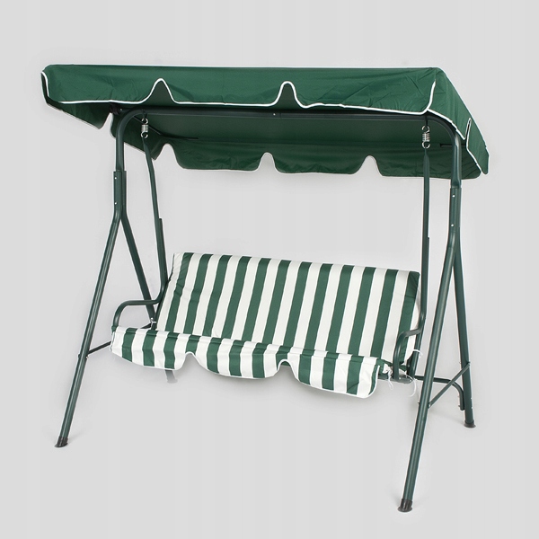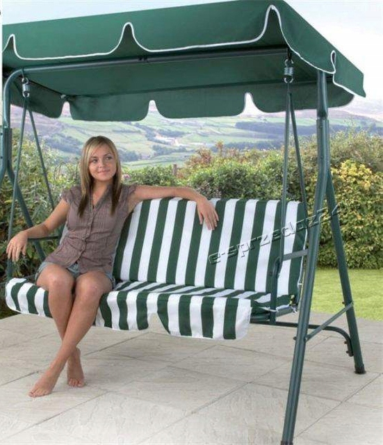 Традиційні, 3-місні садові гойдалки, включаючи біло-зелені смугасті подушки. p>