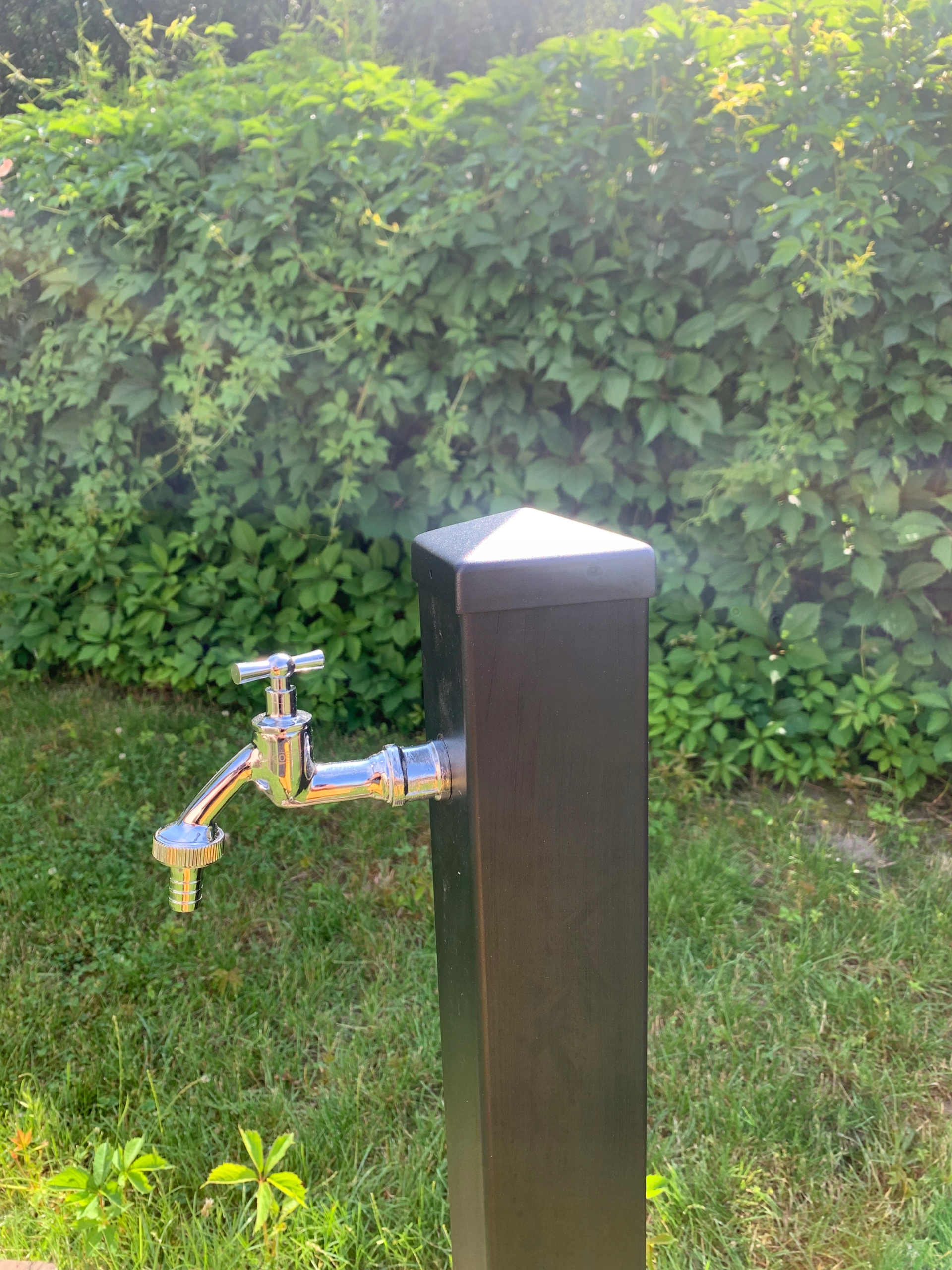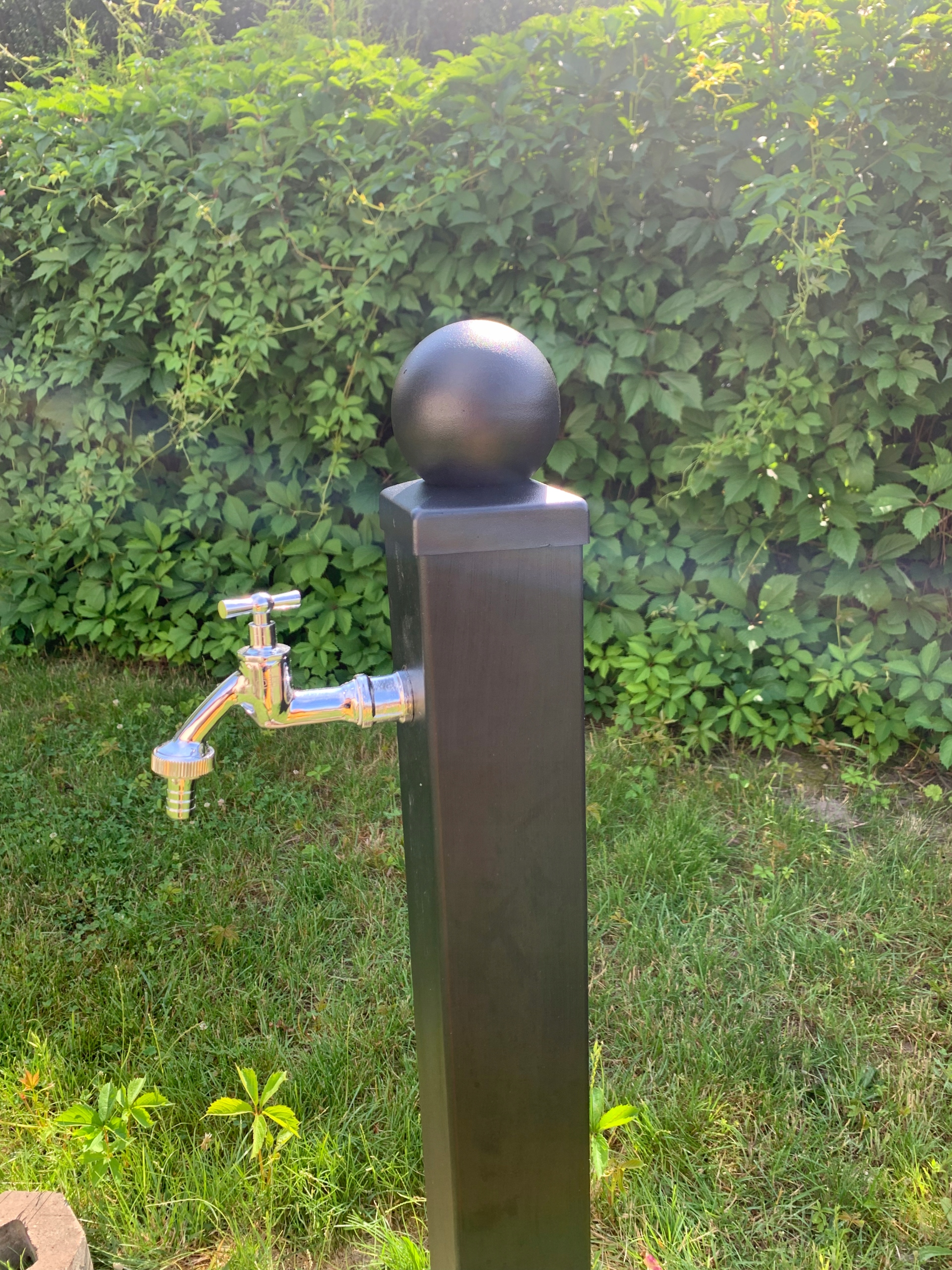 На задній стінці стовпа, на висоті 50 см, монтується розподільник 1/2 (ми отримуємо 2 додаткових виходи, що дозволяють, наприклад, підключити автоматичний контролер поливу, садові шланги або крапельні лінії без необхідності постійно підключати роз'єм на крані).