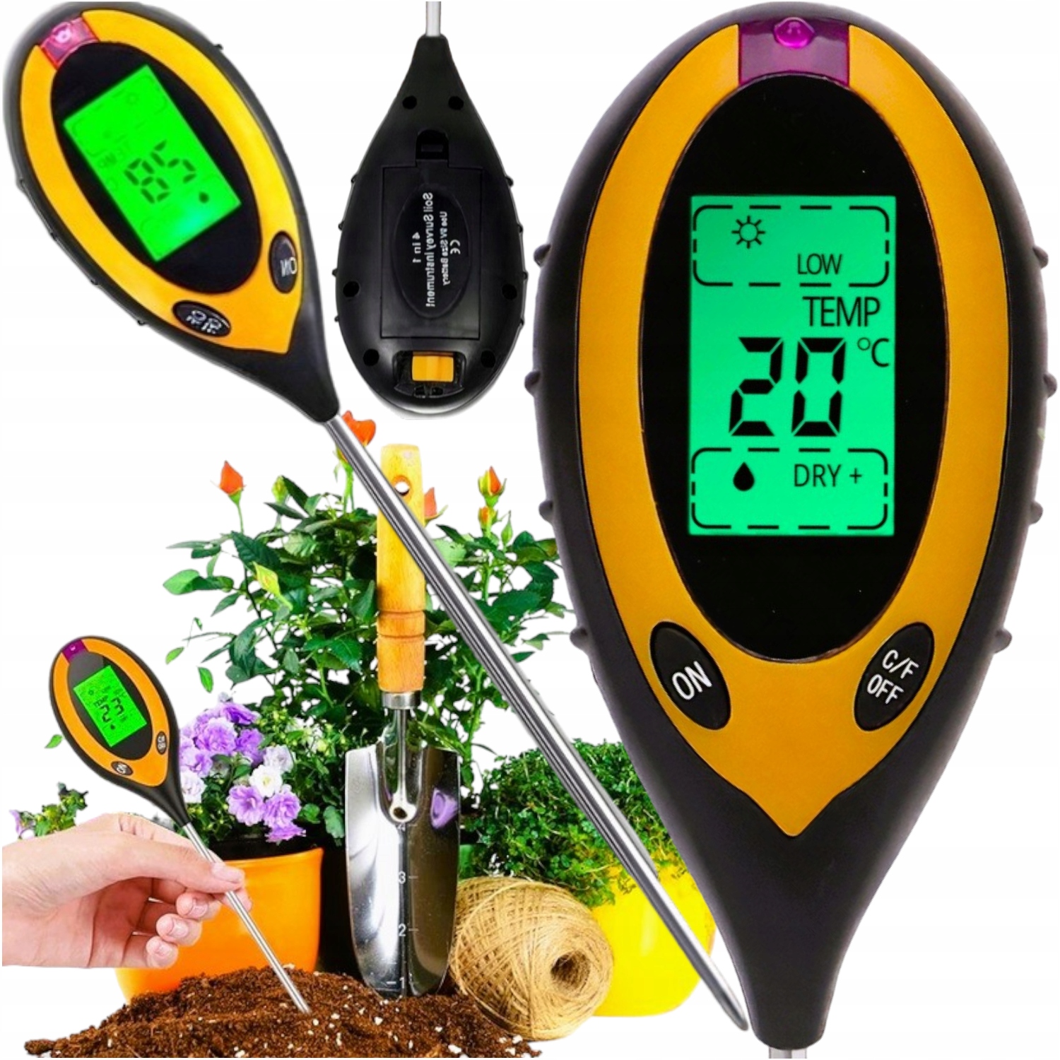 - Вимірювач кислотності ґрунту 4-в-1 — це пристрій, який точно вимірює рН ґрунту, вологість ґрунту, температуру та сонячне світло. Завдяки точним результатам вимірювань ви можете ефективно доглядати за своїми рослинами та забезпечте їм оптимальні умови для росту.