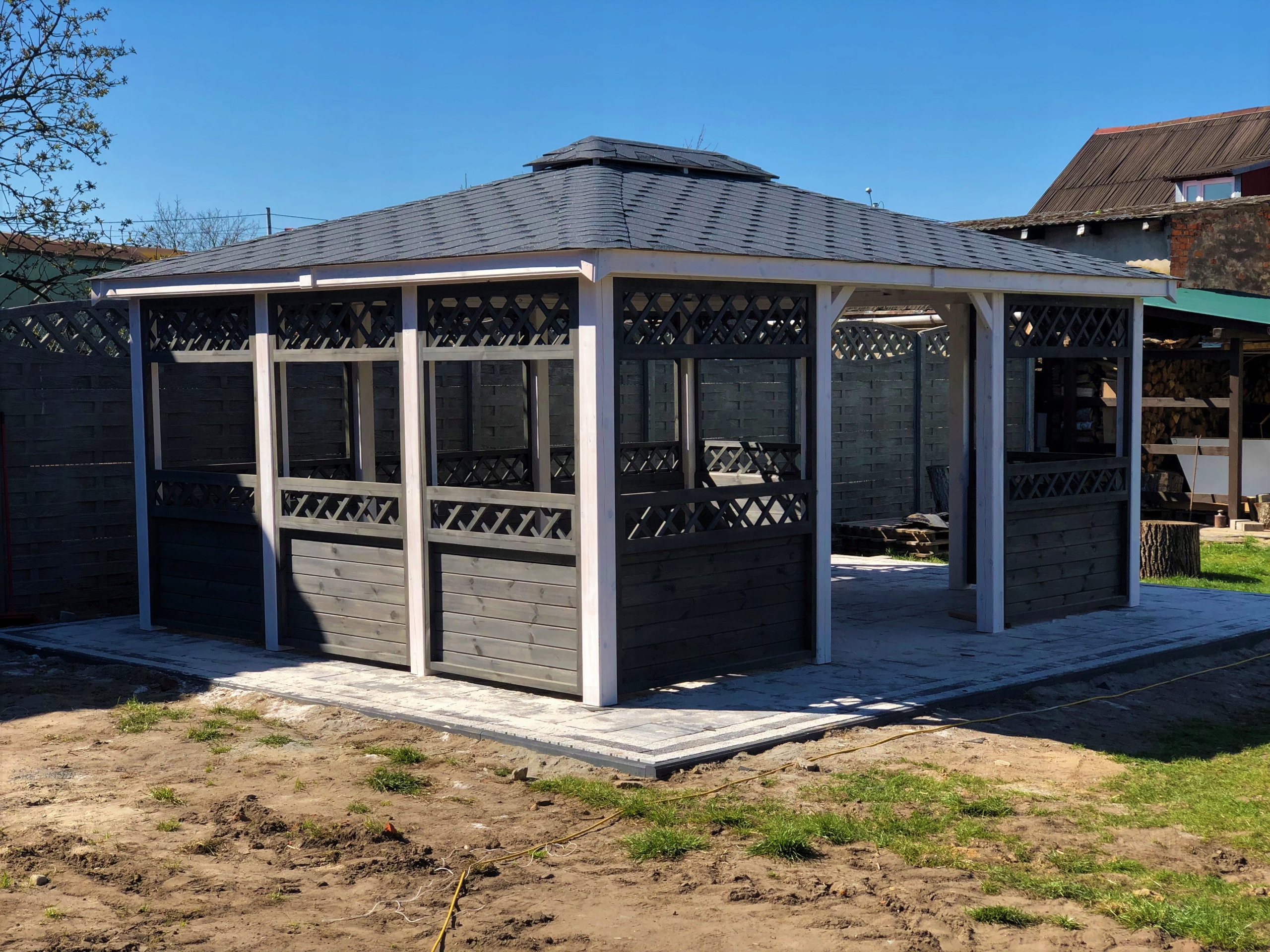 alt drew cosmo пропонує вам сірий білий alana alana розміром 4х3м. Сіро-білий альтанок Orion виготовляється з сушеної ялини/сосни C24 , просоченої деревним кольором у вибраному кольорі. Дах виготовлений з дощок для обшивки , покритих бітумінозною черепицею (колір і форма на вибір). Альтанка та інші її елементи розроблені на запит клієнта.