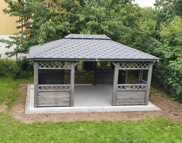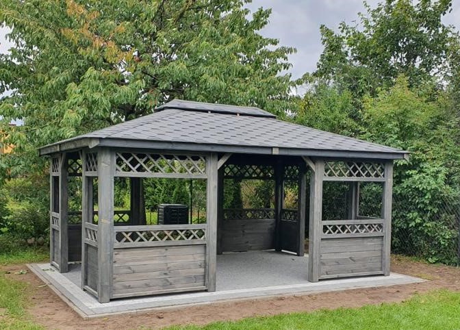 Alt Drew Cosmo пропонує вам 4х3 м оріон Аріон. Альтана Оріон виготовляється з сушеної ялини/сосни C24 , просоченої деревним кольором у вибраному кольорі. Дах виготовлений з дощок для обшивки , покритих бітумінозною черепицею (колір і форма на вибір). Альтанка та інші його елементи розроблені за запитом замовника.