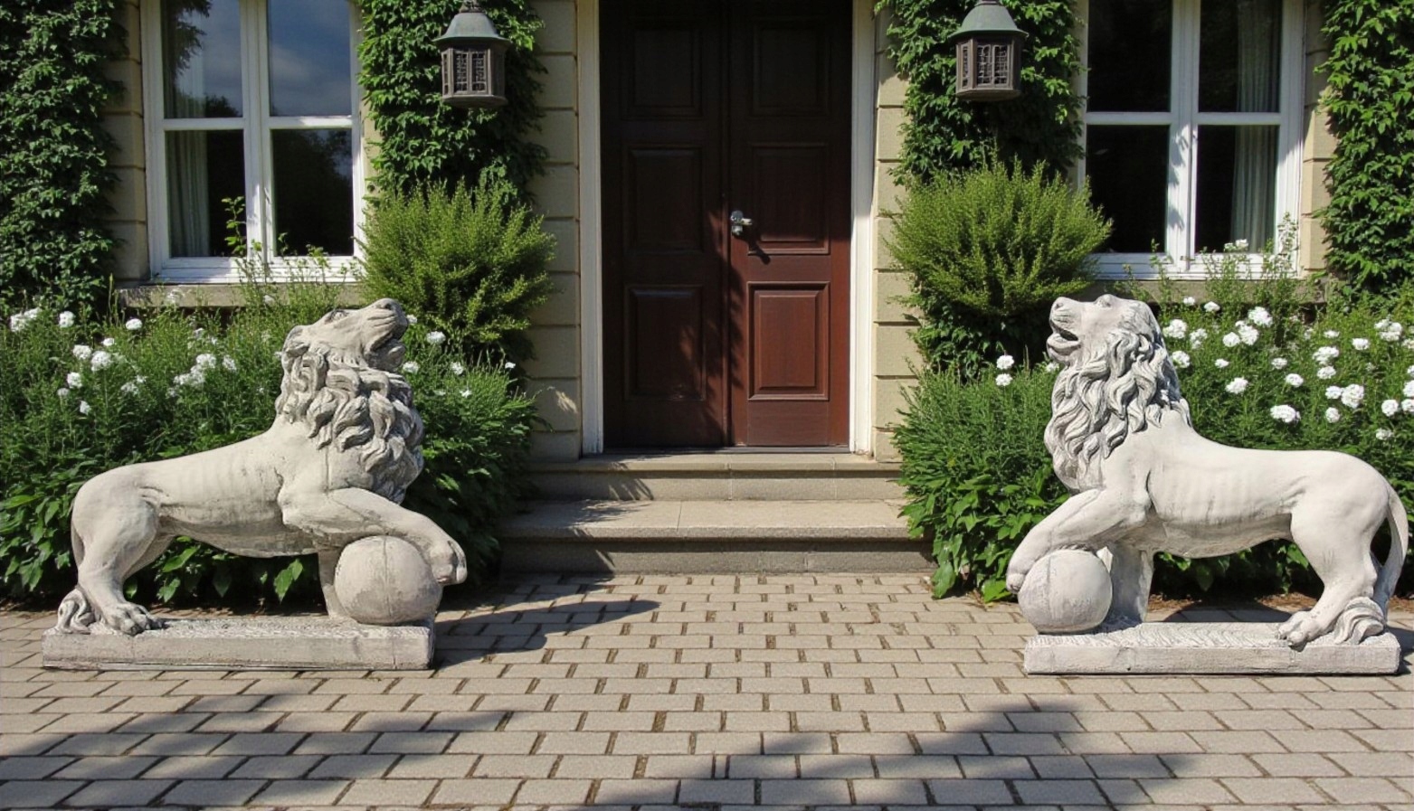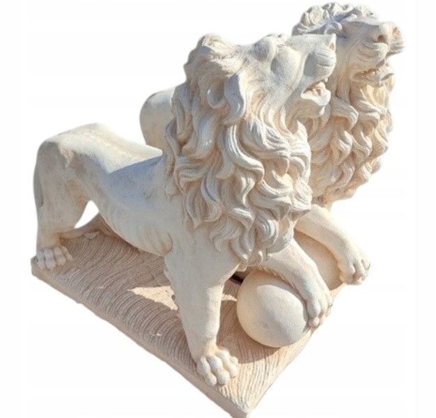 Пара красивих великих штучних левів з кулею, ідеально підходить для розміщення біля входу в будинок або сад. Виготовлений із високоякісного залізобетону зі складними деталями, стійкий до будь-яких погодних умов. Їх також можна придбати окремо. Доступний у кількох кольорах