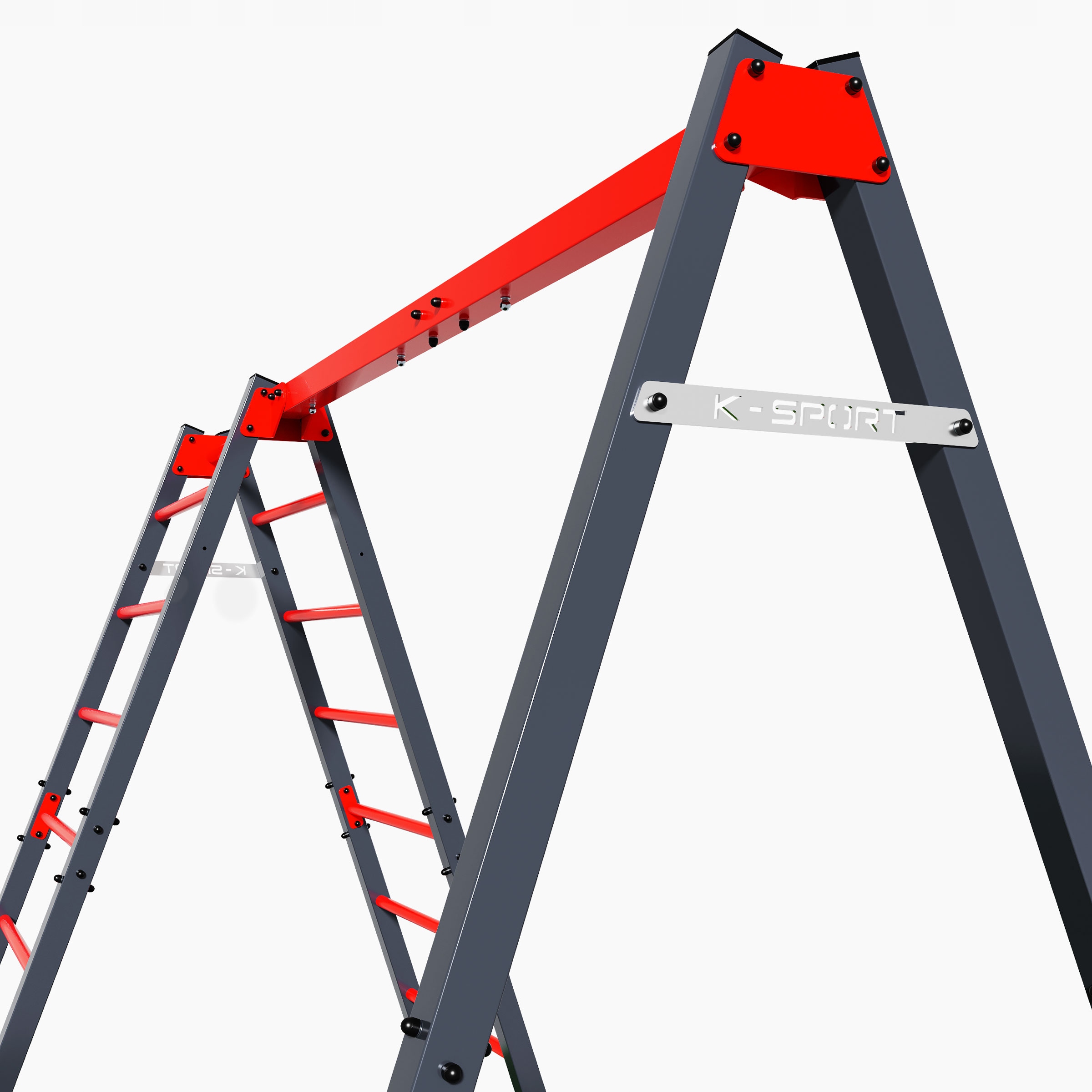 Верхня балка разом з ніжкою рами утворюють тупий кут. Конструкції додатково підсилює драбина, з’єднана за допомогою гвинтових прогонів. Такий тип збірки робить гойдалки стабільними під час гри дітей і забезпечує стійкість конструкції навіть при великих навантаженнях.