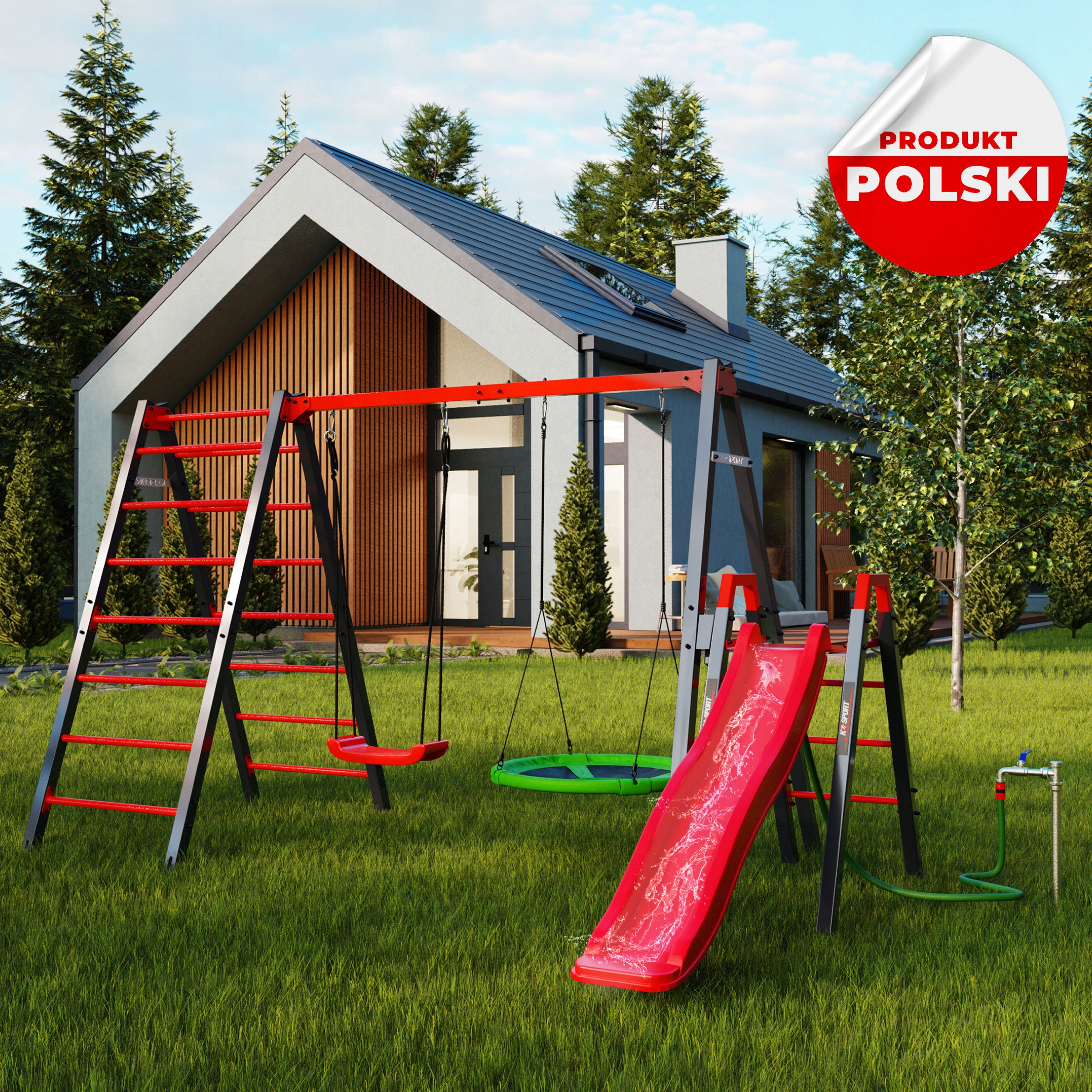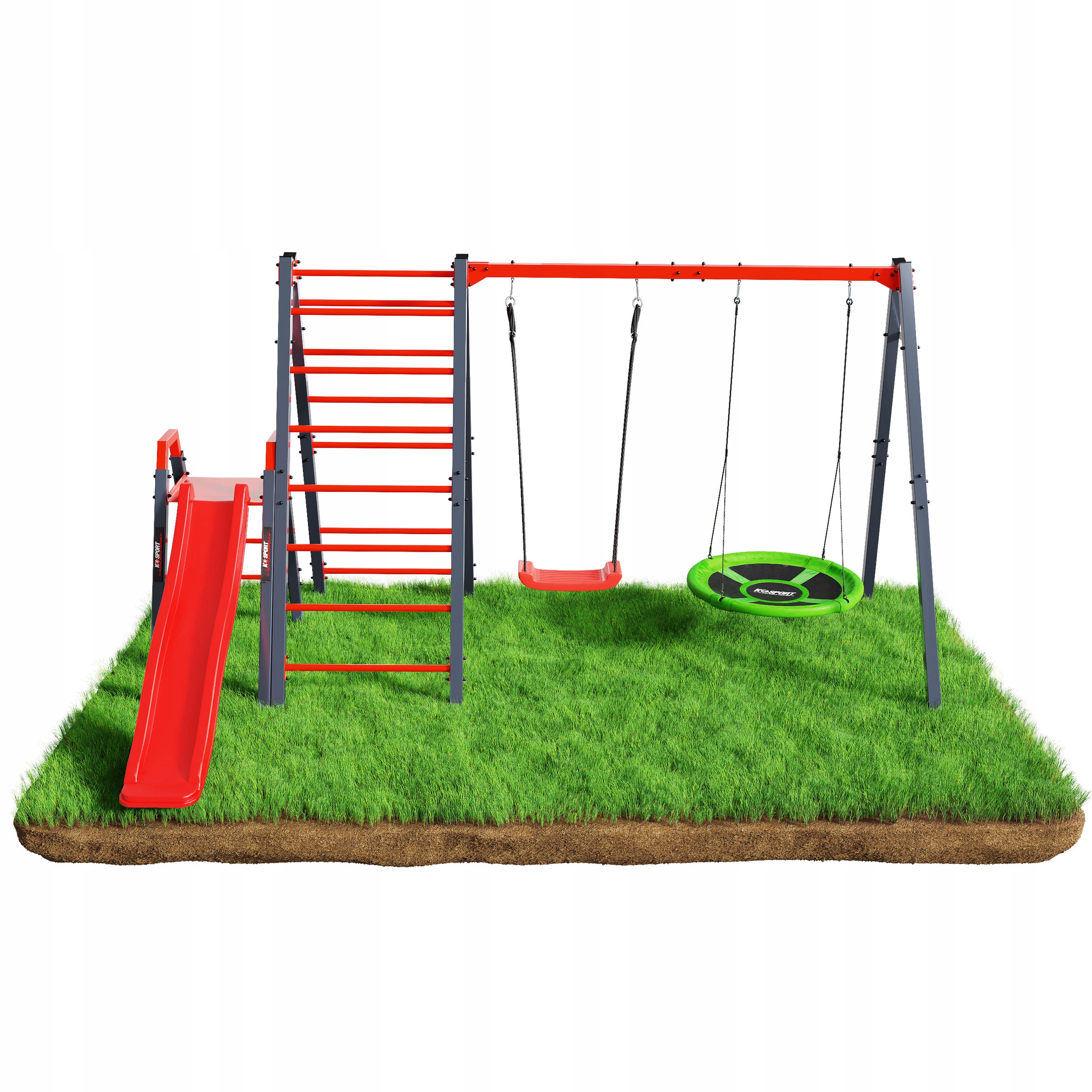 - Якісний, міцний та безпечний подвійний каркас для кріплення гойдалок та гірки. гніздо лелеки, виготовлене із сталевих профілів перетином 50х50. Рамка модного графітового кольору, яка ідеально впишеться у ваш сад.