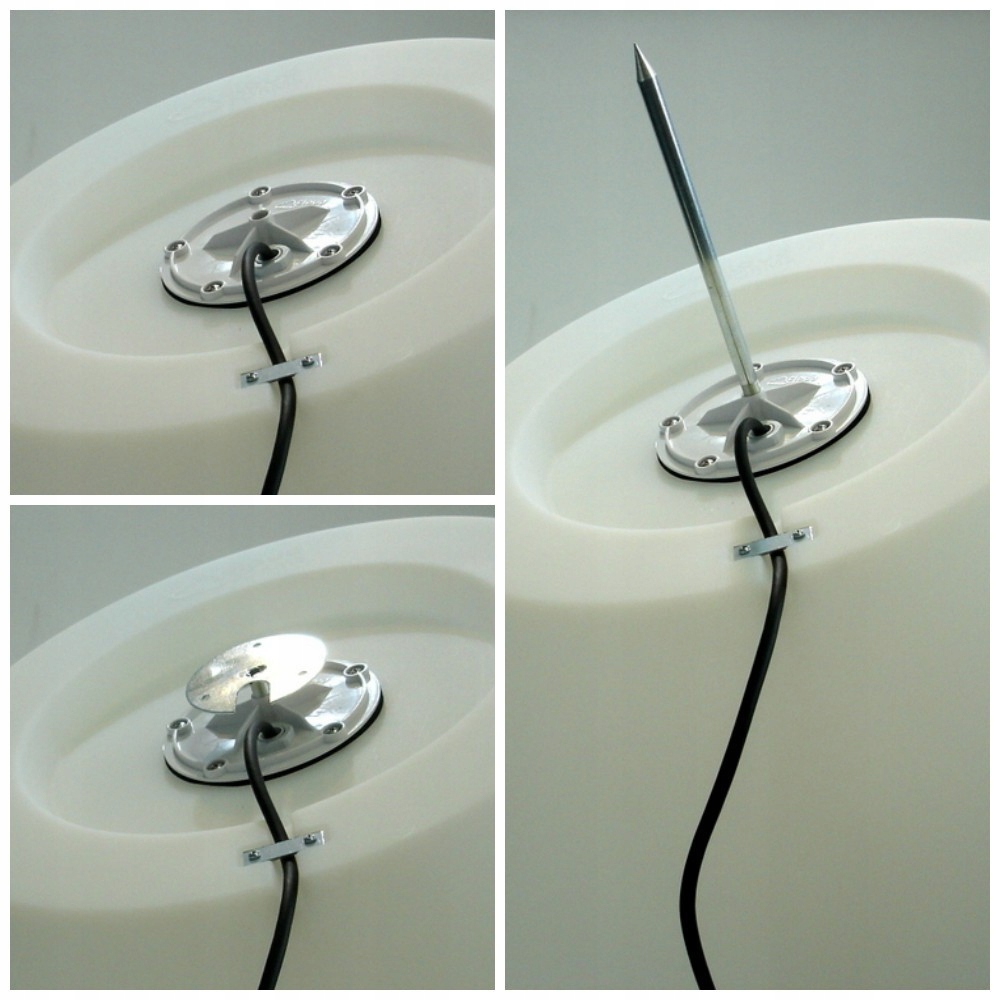 Камінь STONE може вільно стояти на землі або кріпитися до неї за допомогою кронштейнів, що входять до комплекту. В основі є різьба, у яку можна вкрутити шип, щоб заштовхнути м’яч у багнистий, піщаний ґрунт, або ми можемо прикріпити його до бетонної поверхні за допомогою ручки, пригвинченої до бетону трьома гвинтами.