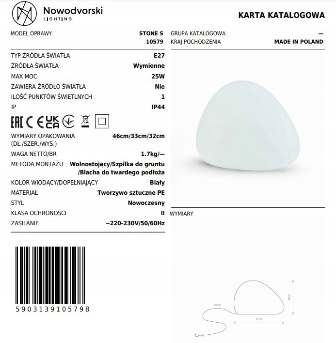 Камінь STONE S 45см виготовлений з міцного поліетилену, що робить його міцним і стійким до температур і вологи. Прикраса легко чиститься. Високий клас герметичності IP44 робить лампу стійкою до будь-яких погодних умов, дощу, граду, поливу в саду.
