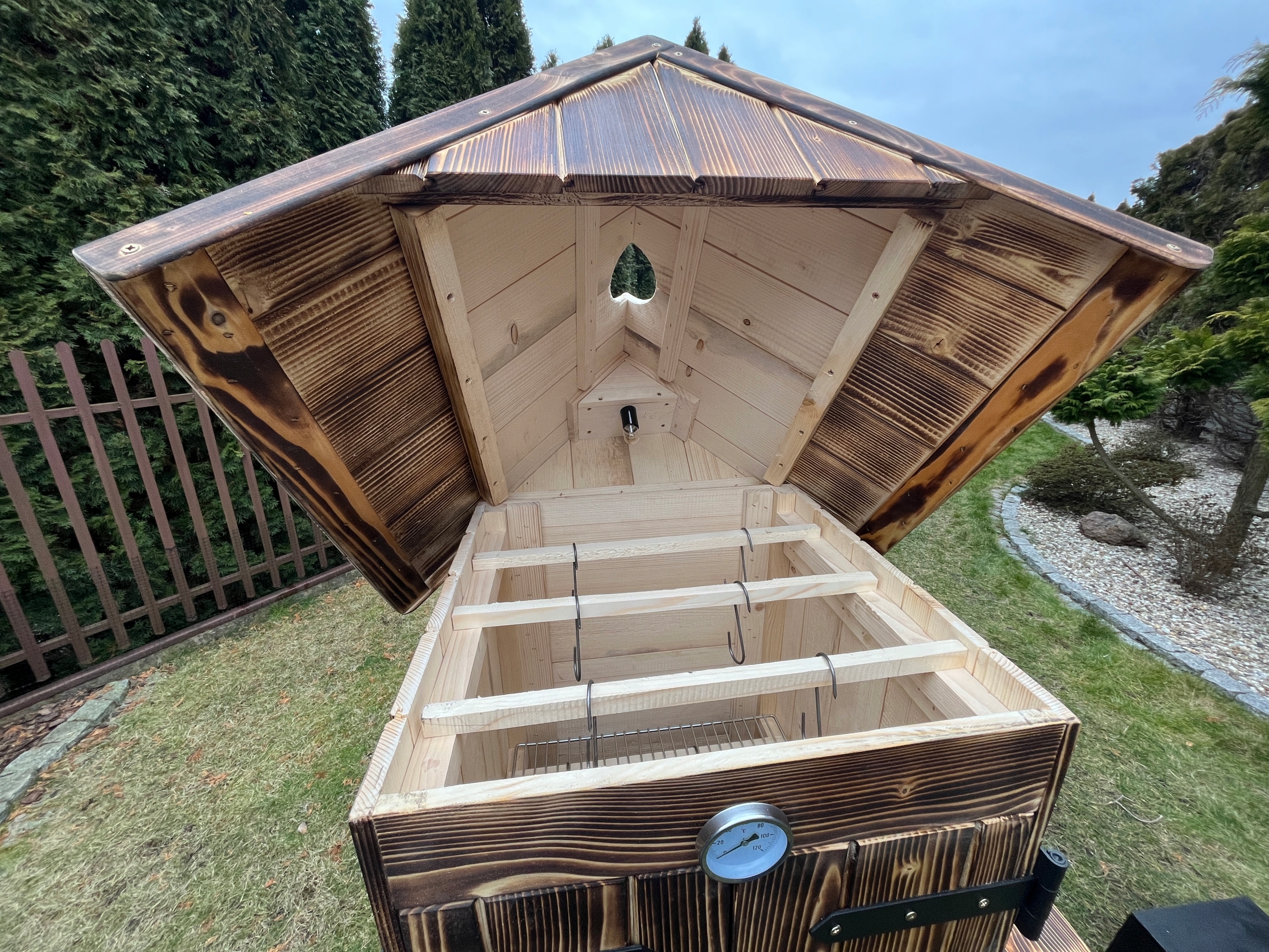 У двосхилим даху ми єдині, хто розміщує камін по центру посередині даху, що, безсумнівно, надає коптильні певного шарму і, як і всі ми знайте, що НАЙБІЛЬША циркуляція диму розташована на найвищому рівні, що дає нам найкращі результати під час копчення, і це те, про що йдеться під час приготування смачної нарізки, риби чи сиру .