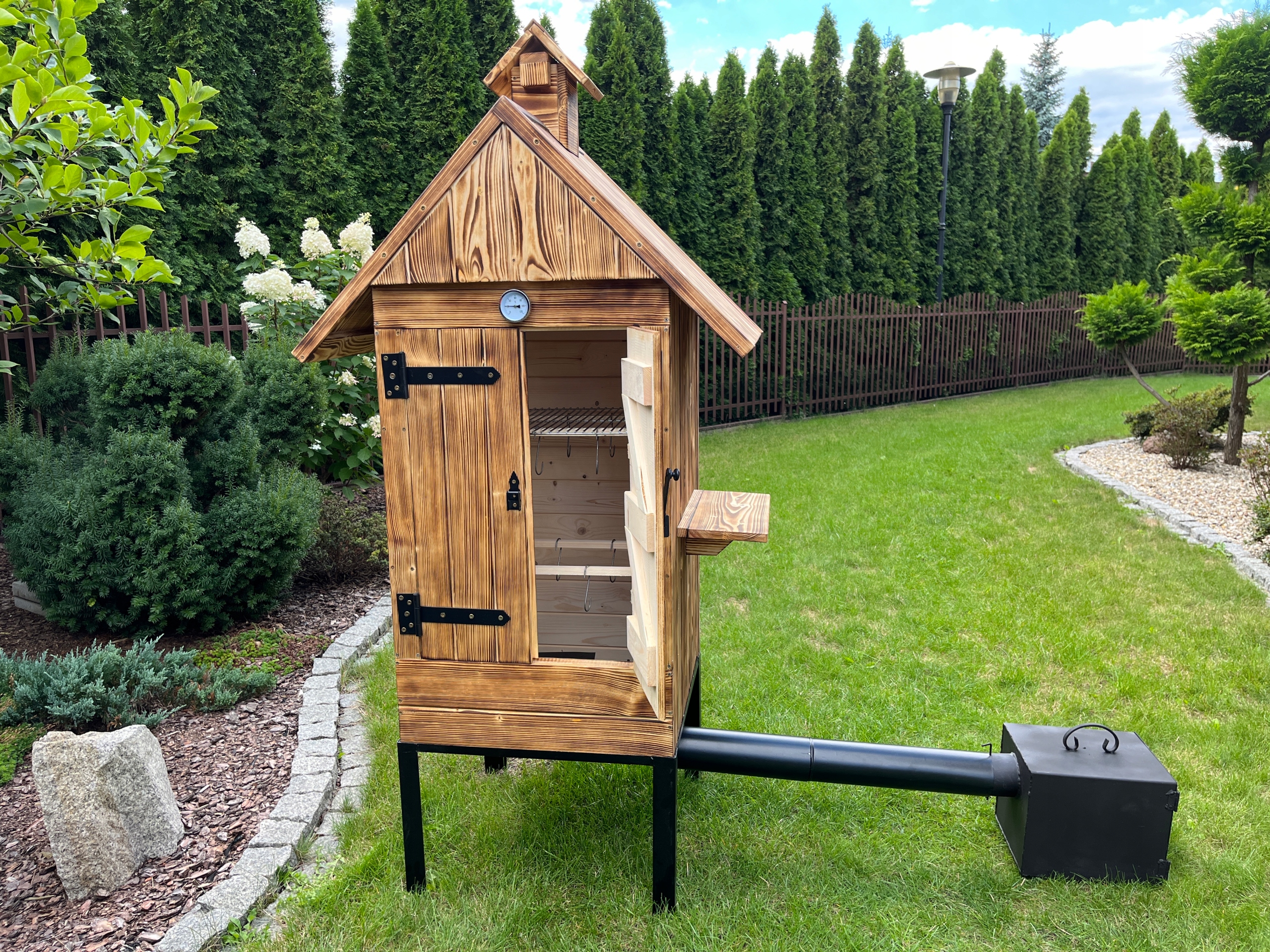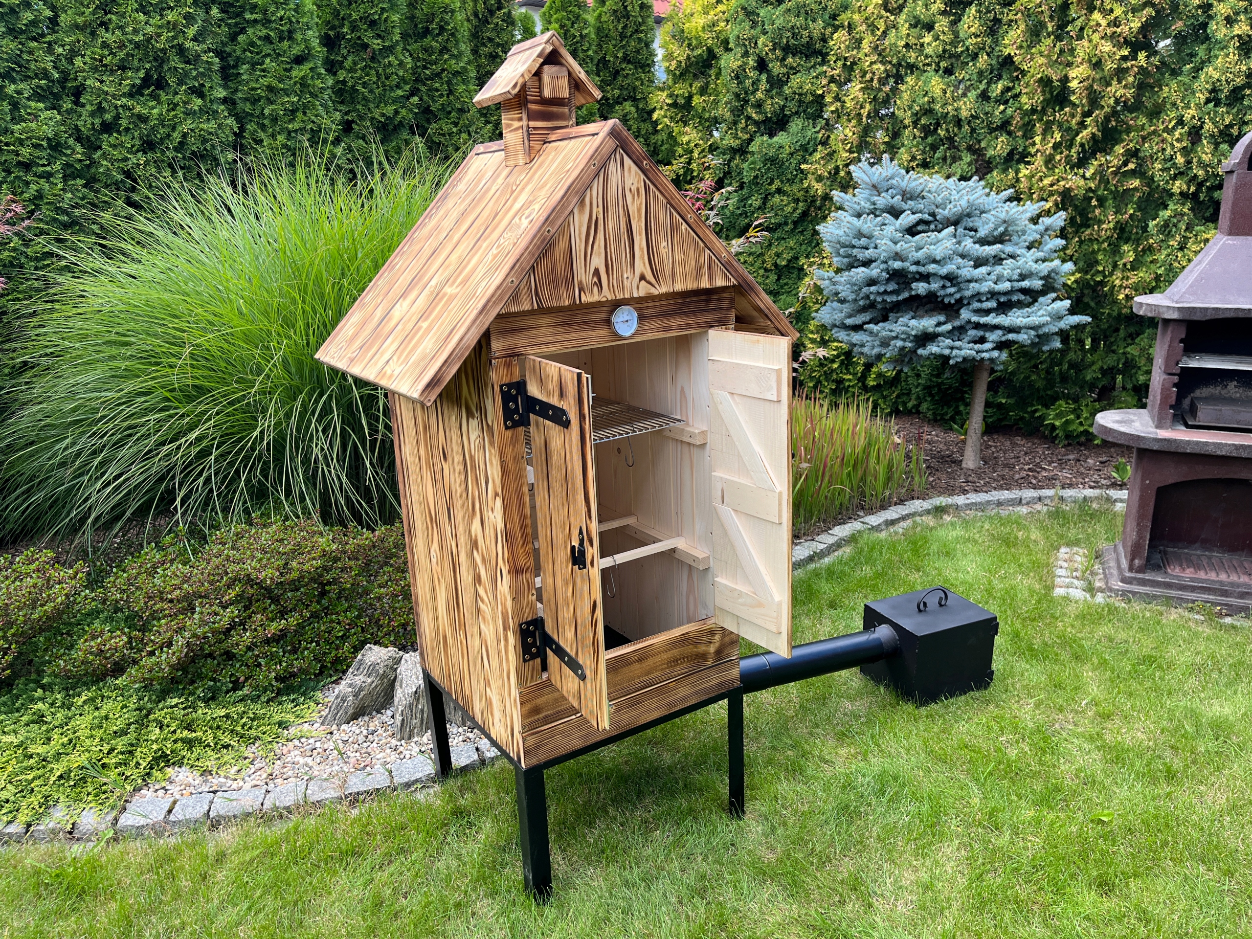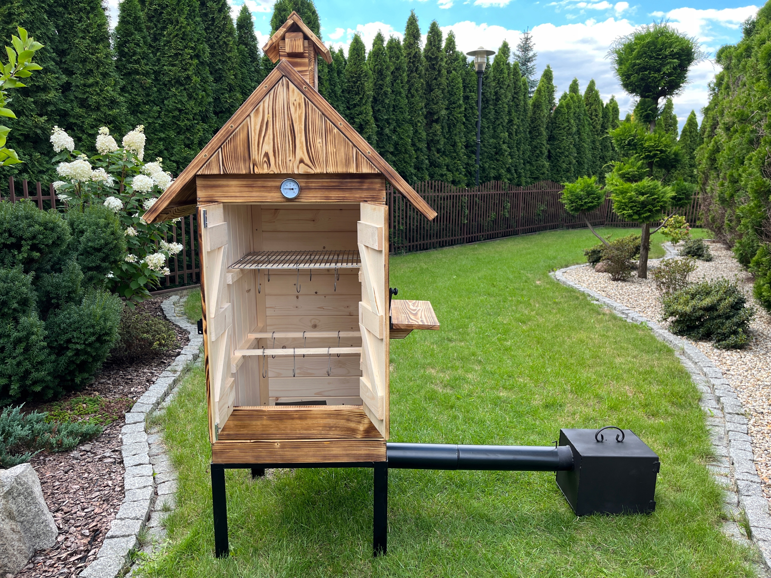 Коптильня має двосхилий дах (ЦЕ НАЙКРАЩИЙ ТИП ДЛЯ КОПТЕННЯ), який вставляється в коптильну камеру, на якій знаходиться камін з регульований потік диму .