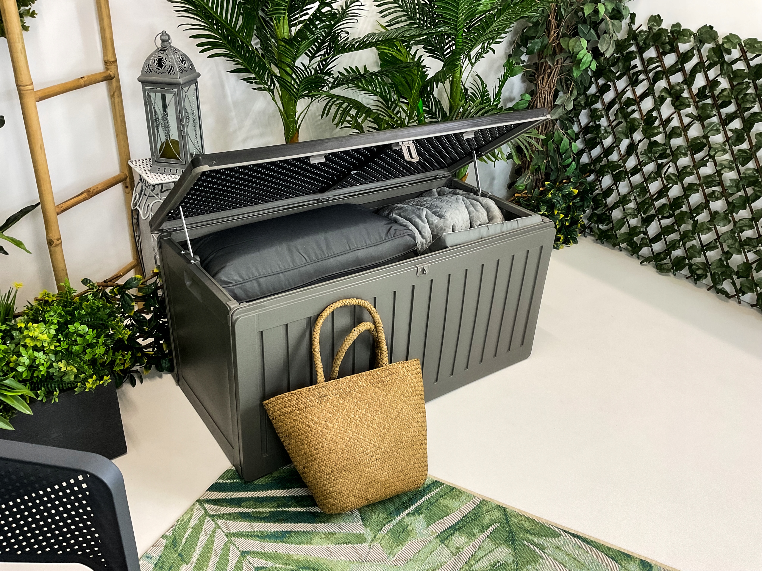 ✔ Висока потужність: Ідеально підходить для зберігання садових аксесуарів, подушок, інструментів та іграшок. Для більшої безпеки.