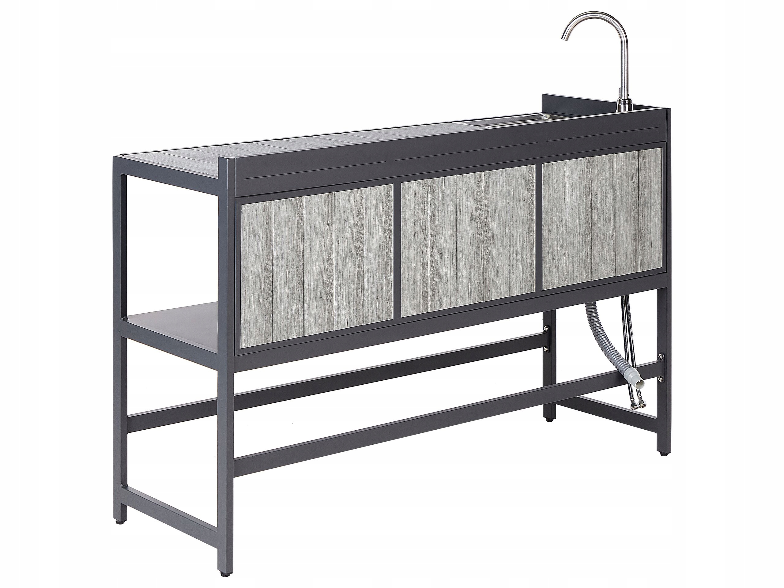 Перетворіть свій зовнішній простір за допомогою цього стильного та універсального набору, який ідеально підходить для сучасного оформлення. Виготовлений із міцного алюмінію з порошковим покриттям, зі стільницею та робочими поверхнями з синтетичного дерева, цей набір стійкий до погодних умов і потребує мінімального догляду, забезпечуючи тривале використання. Колекція, стійка до ультрафіолетового випромінювання, включає три ключові елементи: робочу станцію з раковиною та полицею для зручного приготування їжі, шафу з прихованою ємністю для льоду, ідеальну для охолодження напоїв, і практичний візок для сервірування, який легко пересувається завдяки коліщаткам. Кожен елемент можна використовувати окремо або поєднувати з іншими, що забезпечує повну гнучкість у адаптації простору до індивідуальних потреб. Цей сучасний набір поєднує в собі функціональність з елегантним дизайном, що робить його ідеальним доповненням до веранди чи патіо.