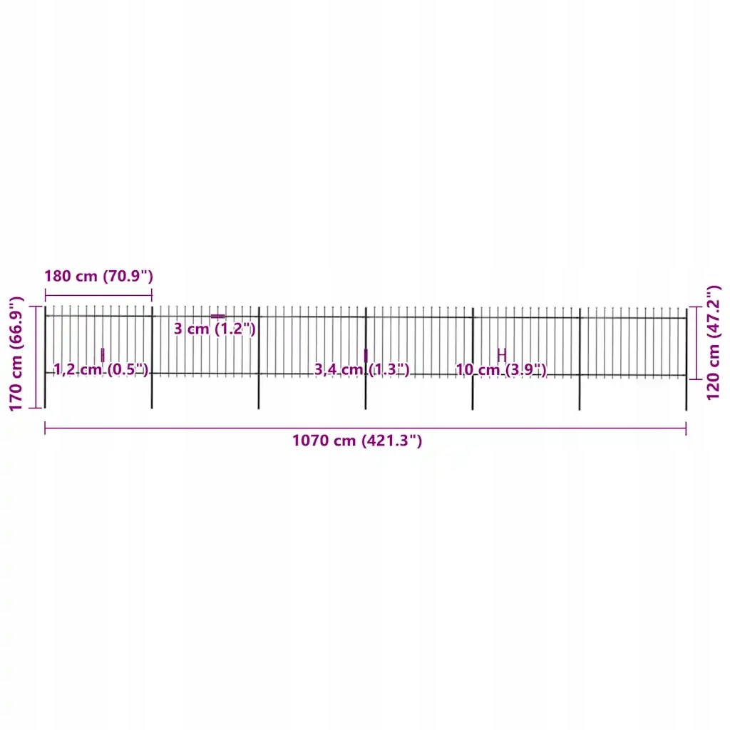 Наша декоративна садова огорожа, виготовлена зі сталі з порошковим покриттям, є ідеальним рішенням для захисту вашого саду, будинку або доріжок. Огорожа, що складається з 6 панелей і 7 стовпів, має загальну довжину 1070 см і забезпечує надійність і довговічність.