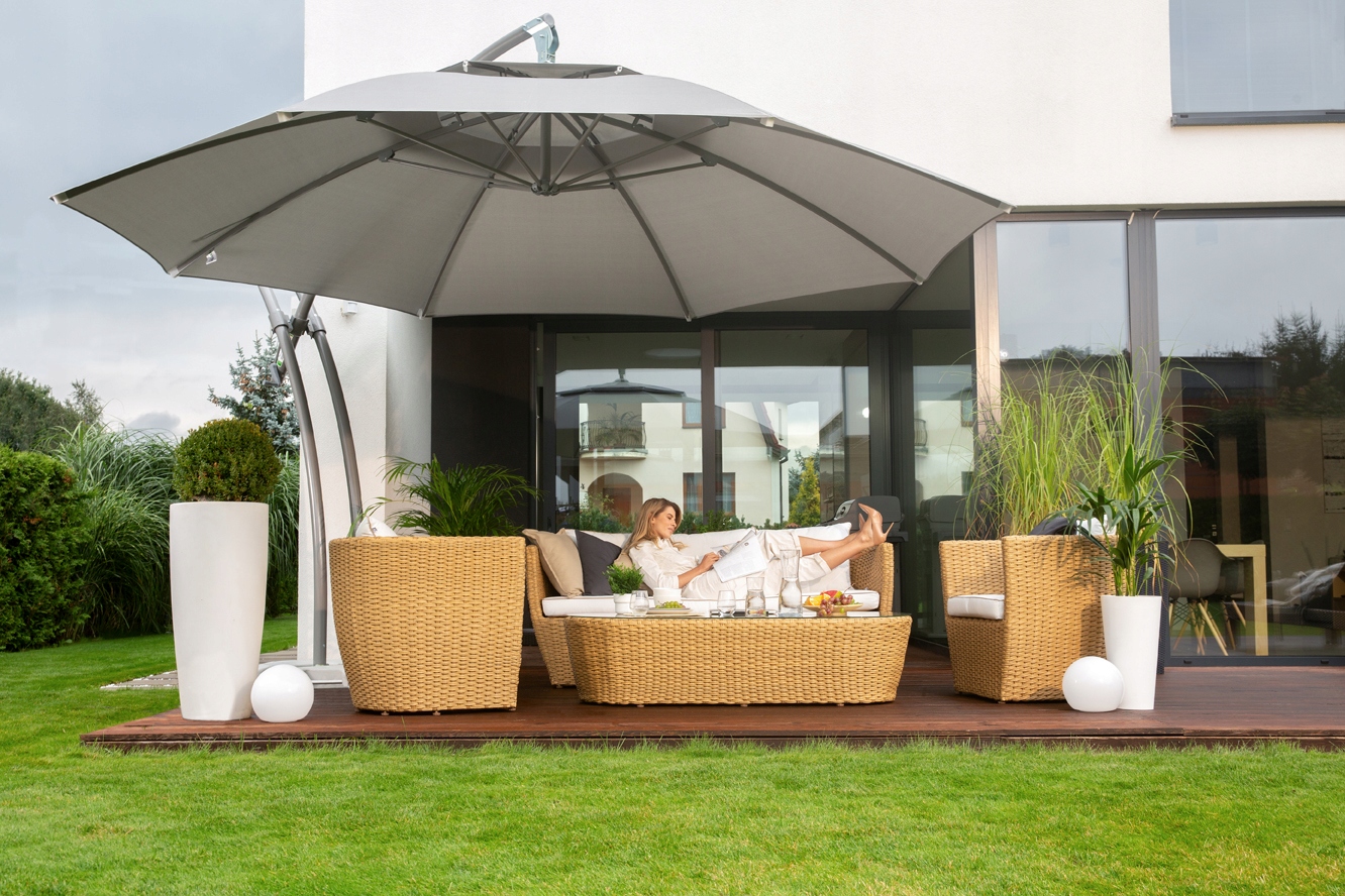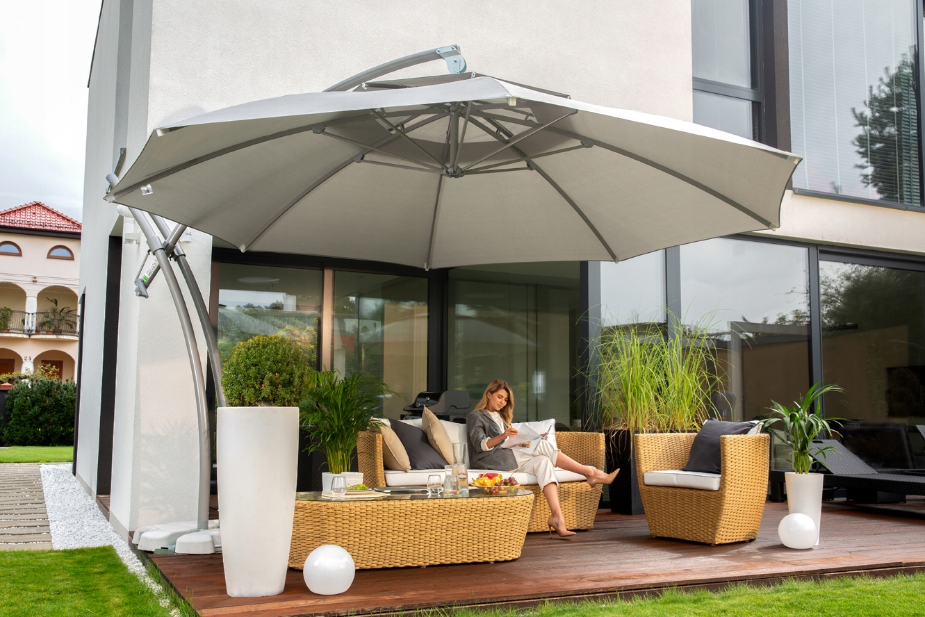 Ексклюзивні садові парасольки Ibiza були розроблені з урахуванням останніх тенденцій, завдяки чому вони відрізняються унікальною структурою та цікавим дизайном. Модель садової парасольки Ibiza чудово виглядатиме в сучасних садах, на великих і малих балконах і терасах.