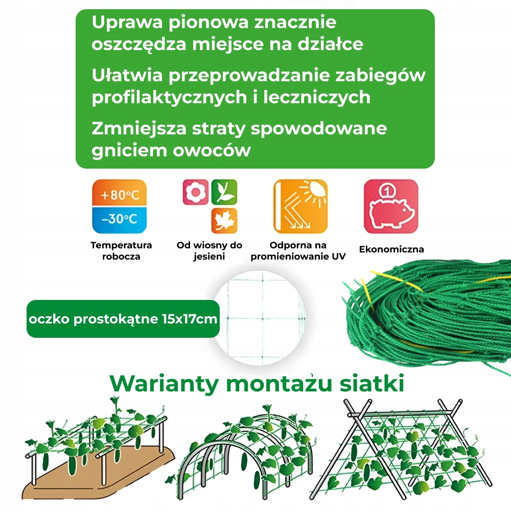 Суцільна садова сітка 1,8x0,9 м - це необхідна підтримка для сходження овочів та квітів у вашому саду! Ідеально підходить для вирощування огірків, помідорів, гороху, квасолі або винограду, забезпечує стабільну підтримку, полегшуючи ріст та збільшення врожайності. Виготовлений з довговічного, резистентного від ультрафіолетового поліпропілену, він міцний і стійкий до морозу, дощу та вітру. Великі очі ( 15x17 см ) дозволяють легко отримати доступ до рослин, а зелений колір вміщається в оточення. Сітка гнучка, проста в установці та скорочення, що дозволяє адаптувати її до знижки, квіткових грядків або теплиці. Вертикальне вирощування економить простір, мінімізує гниль плодів і полегшує лікування догляду. Присвячені садівникам, які цінують комфорт та здорові культури.