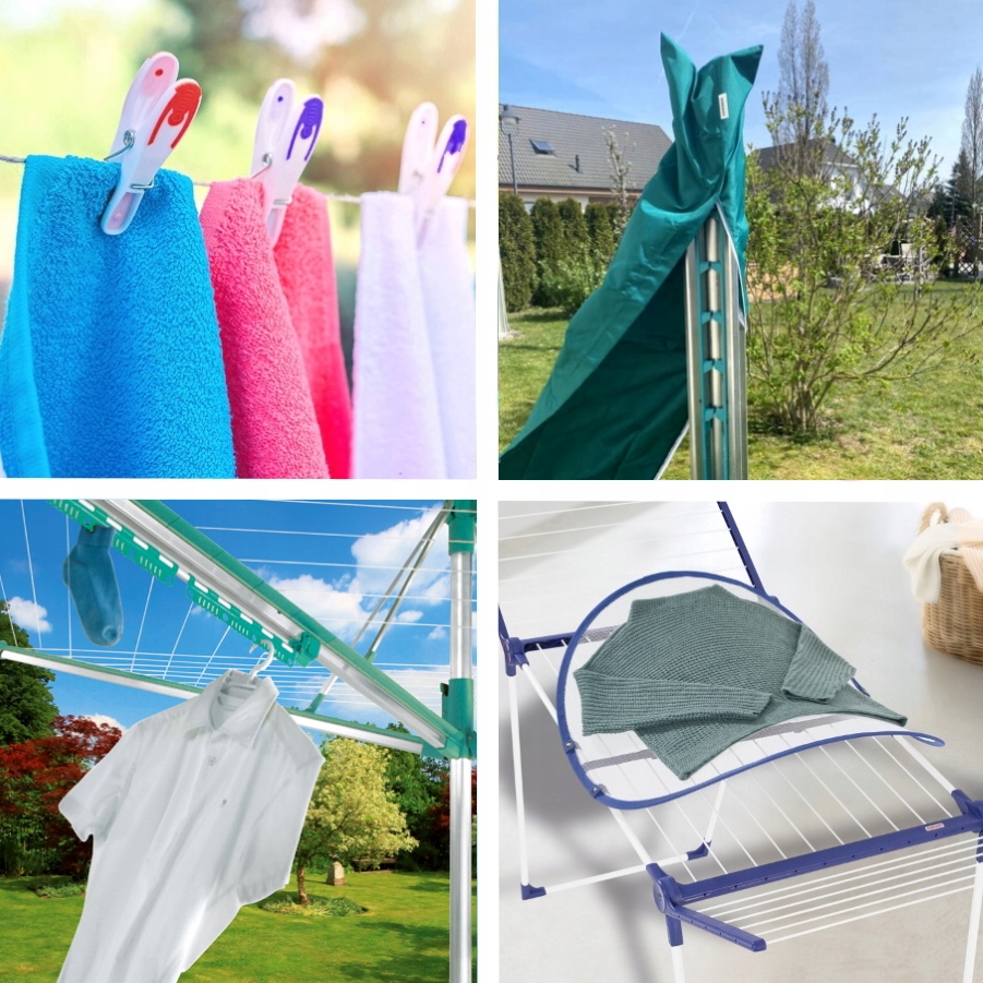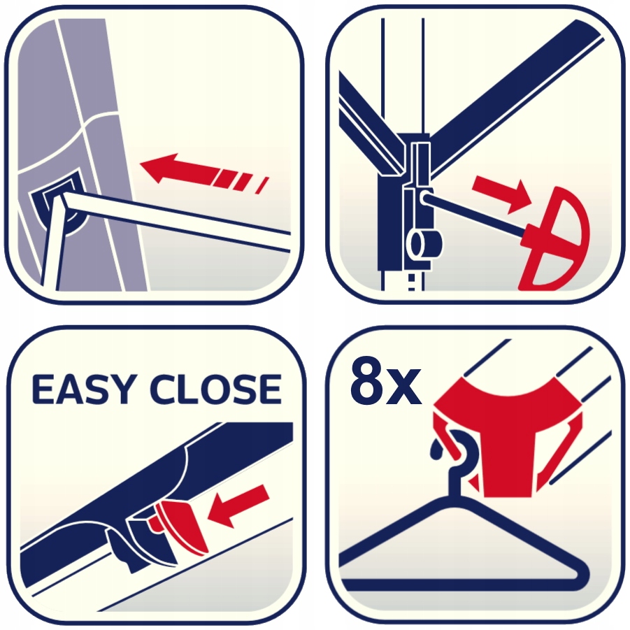 Кракція натяжного кабелю: Автоматичний механізм потягу захищає натяжний кабель, який не лежить на землі, тому ніхто не спотикається над ним і не буде загрожувати, наприклад. при скошуванні трави. Плече з двох ручок для вішалки, дозволяють сушити без складок, загалом вісім блузок або сорочок, які не впадуть з них навіть під час вітру.