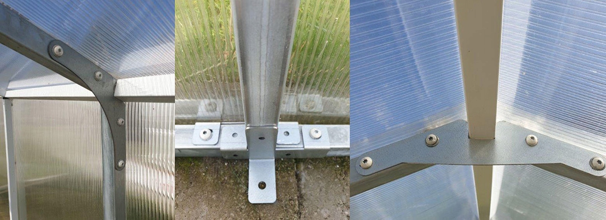 Конструкція теплиці з’єднується за допомогою дуже міцних і міцних швидкоз’ємних з’єднувачів, які потім згвинчуються шурупами з ПВХ.
