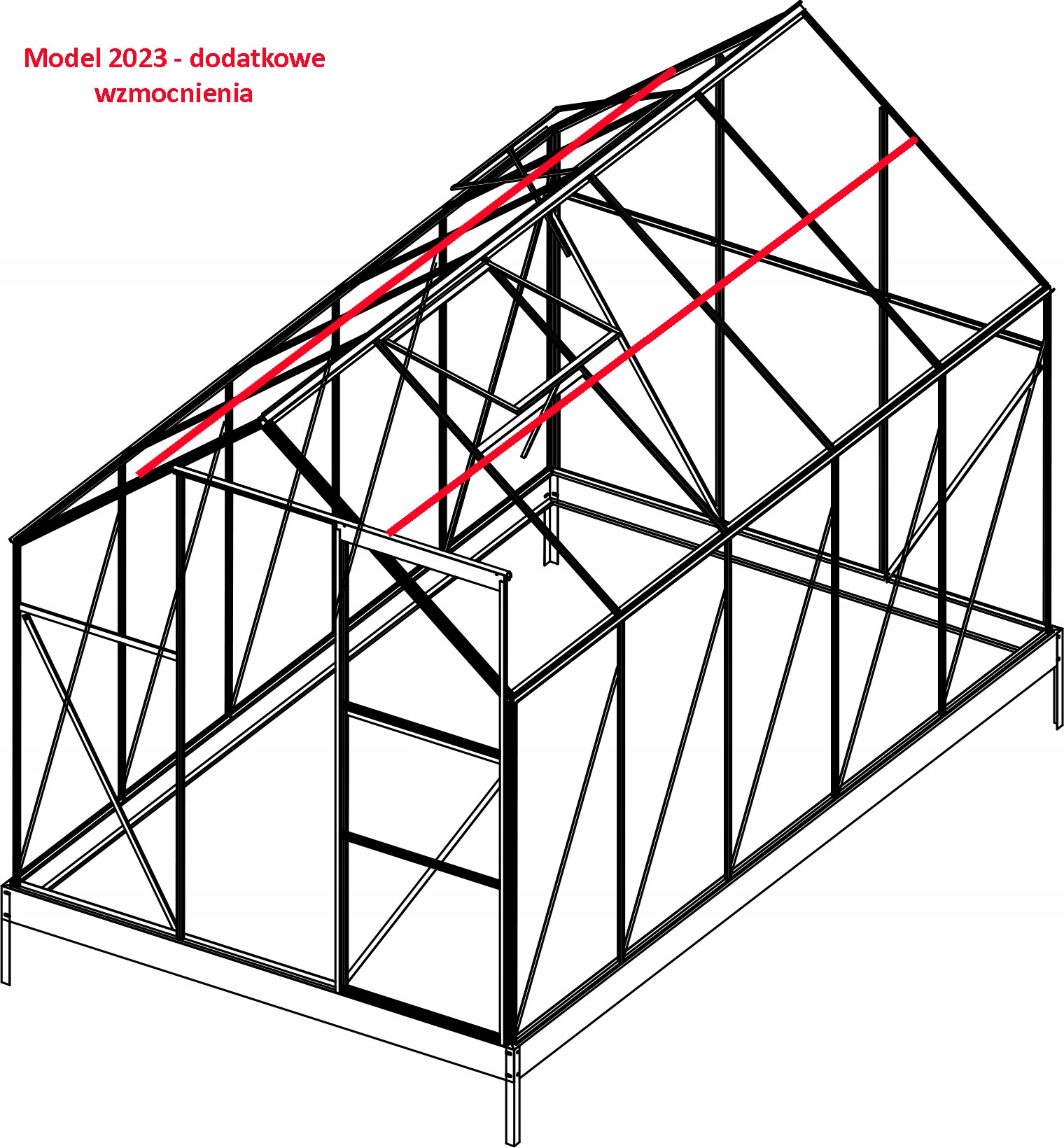 У цій моделі використовуються полікарбонатні пластини підвищеної щільності товщиною 4 мм. Конструкція стійка і стійка до сильного вітру і снігу. Модель 2023 включає додаткові посилення для кожної полікарбонатної пластини, що повністю захищає пластини від продування всередину. Теплиця у верхній частині має спеціальні зміцнення, які дозволяють підв’язувати, наприклад, гілки помідорів. Між профілями вставляються полікарбонатні плити, які додатково захищають їх від здування сильним вітром.
