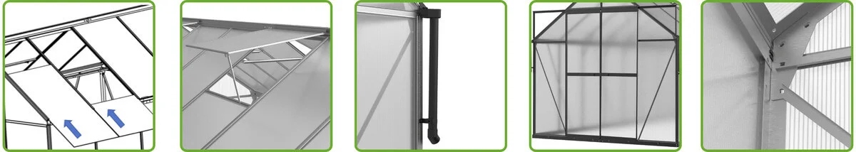 Теплиця з полікарбонату з інноваційною системою Slide-In є ідеальним рішенням для садівників, які цінують легкий монтаж і довговічність. Полікарбонатні панелі вставляються безпосередньо в каркасну конструкцію, позбавляючи від необхідності використовувати металеві шпильки та інструменти. >. Це робить збірку швидкою навіть для новачків. Міцне кріплення панелей забезпечує виняткову стійкість до вітру та складних погодних умов, зводячи до мінімуму ризик пошкодження. Перевірте роботу системи Slide-In у нашому відео та відкрийте для себе переваги теплиці Cultivo!