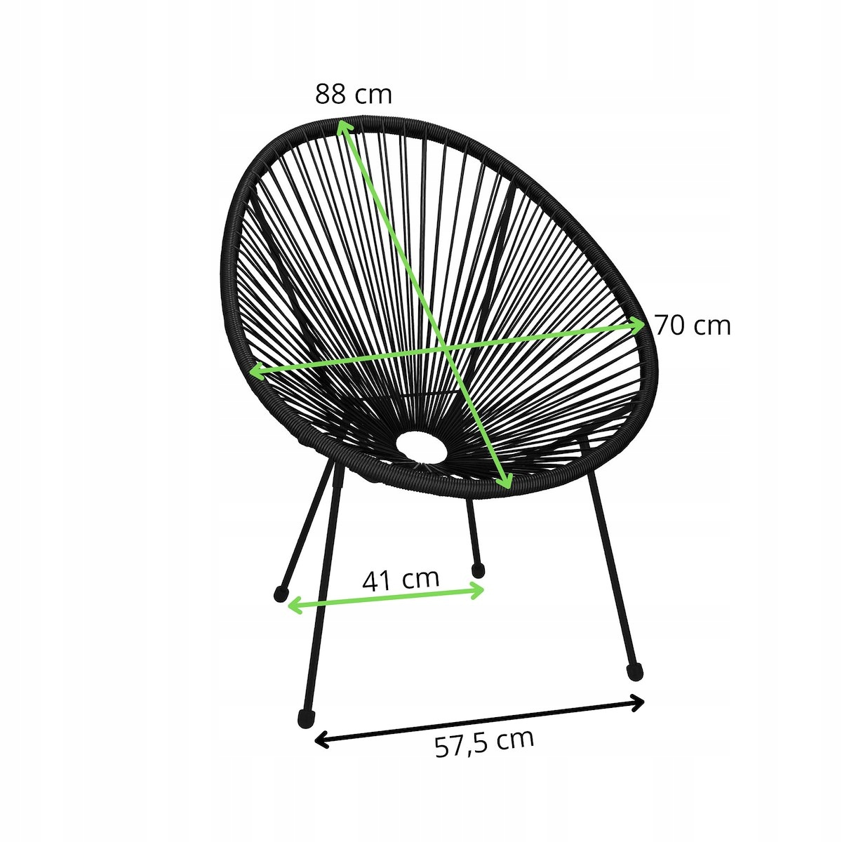 Крісло виготовлене з металевого каркасу і щільно натягнуті поліетиленові шнури (ПЕ ротанг). Ніжки мають лапки, які захищають поверхню від подряпин.