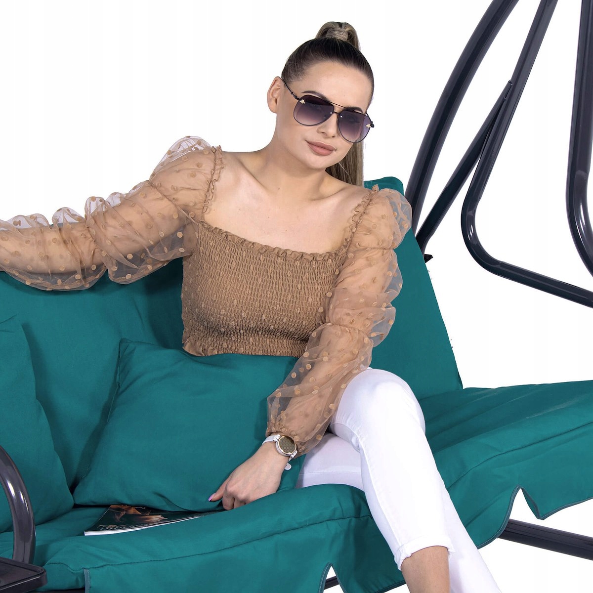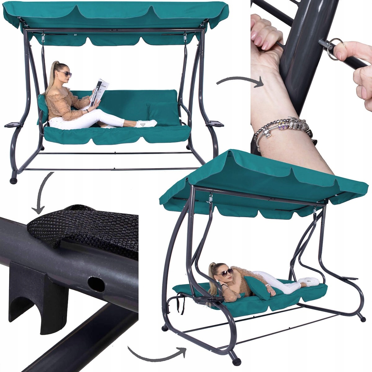 bujana диван дозволяє вам відпочити в літні дні та вечори з вашими близькими. комфортно , підключені подушки, нанесені на сидіння та спинку, дозволяють відпочити максимум на відкритому повітрі. Регульований дах дозволить індивідуальну відповідність протягом кожного часу доби, щоб сонце не ображало користувачів. Після розповсюдження спинки, підвісне шезлонг забезпечить повний відпочинок. Бічні столи Забезпечте легкий доступ до напоїв або інших дрібничок.